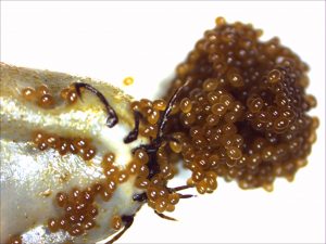Samička sa po plnom napití uvoľní a z hostiteľa odpadáva. V tráve alebo lístí vo vlhkom prostredí vyloží počas niekoľkých týždňov 3- až 4-tisíc vajíčok, z ktorých sa liahnu larvičky. Tým sa končí životná púť aj pani kliešťovej a umiera. Tento životný cyklus kliešťa obyčajného zvyčajne trvá dva až tri roky, no v severnejších alebo chladnejších oblastiach dokonca až päť alebo šesť rokov.