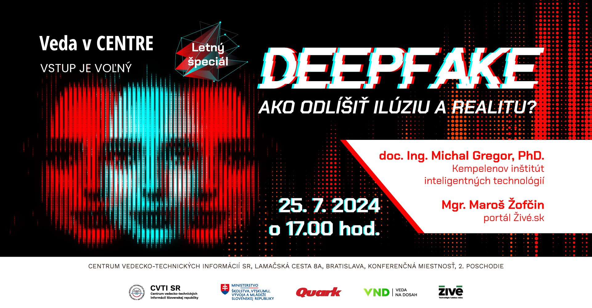 Letný špeciál vedeckej kaviarne CVTI SR bude venovaný fascinujúcemu a zároveň kontroverznému fenoménu súčasnosti – deepfake. O tom, ako rozoznať ilúziu od skutočnosti, budú diskutovať výskumník Michal Gregor z Kempelenovho inštitútu inteligentných technológií a redaktor a novinár Maroš Žofčin z portálu Živé.sk.