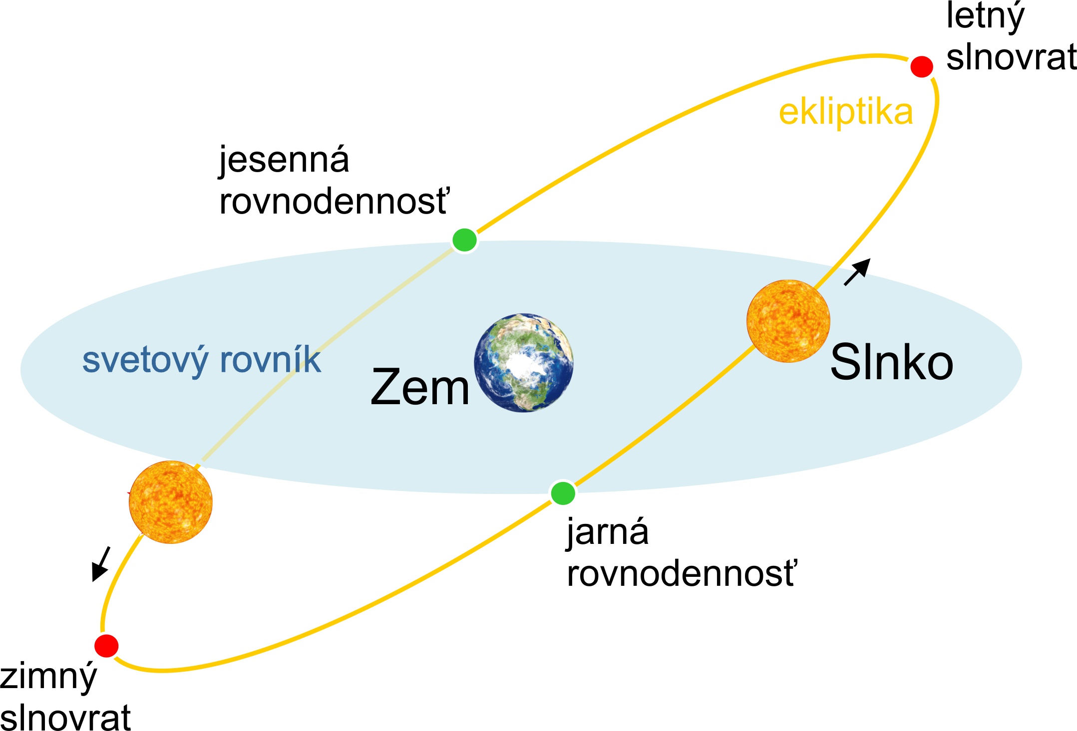 Zem vykonáva v priestore dva základné pohyby: rotuje okolo svojej osi a obieha okolo Slnka. Pre pozorovateľa na Zemi tieto pohyby na oblohe definujú dve najdôležitejšie kružnice: rovník a ekliptiku. Rovník určuje zemská rotácia – jeho rovina je kolmá na zemskú (rotačnú) os. Svetový rovník na oblohe si možno predstaviť ako priemet pozemského rovníka na oblohu. Ekliptika je kružnica, priesečnica roviny dráhy Zeme s nebeskou sférou, alebo – pri pohľade zo Zeme – kružnica, po ktorej sa zdanlivo pohybuje Slnko. Rotačná os Zeme s ňou zviera uhol 66,5°.