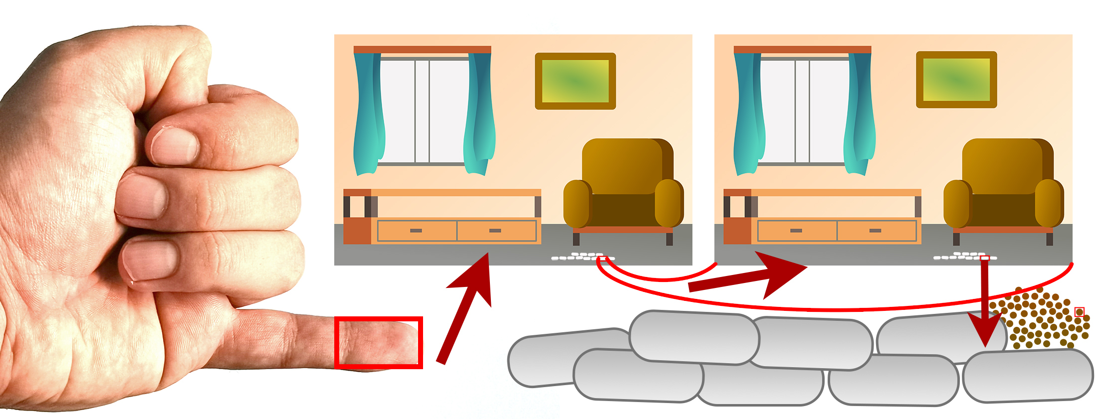 Aby sme ilustrovali veľkosť atómu, vystrime malíček na ruke a predstavme si, že jeho posledný článok je veľký ako naša obývačka. Pre lepšiu predstavu vysypme na stôl za hrsť ryže. Miestnosť naplnená od podlahy až po strop zrnkami ryže by znázorňovala počet buniek v našom malíčku. Teraz je jedno zrnko ryže veľké ako jedna bunka. Po ďalšom priblížení je jedna takáto bunka veľká ako obývačka. Opäť miestnosť naplňme zrnkami ryže a v tejto mierke bude jedno zrnko ryže veľké približne ako jeden proteín. A keď ďalej priestor medzi zrnkami ryže vyplníme jemným pieskom, jedno zrnko piesku bude veľké približne ako jeden atóm.