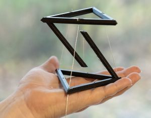 Už pri spájaní rohov podstáv špagátmi si môžeme všimnúť, že pri spojení tretieho rohu nám stredný špagát, ktorý spája tvary C, začína klásť odpor, pričom cítime napätie. Spájanie rohov podstáv je potrebné urobiť dostatočne presne tak, aby podstavy boli navzájom rovnobežné. Dôležité je, aby niektorý zo špagátov nebol príliš krátky alebo, naopak, veľmi voľný. Najjednoduchším spôsobom je spojiť hornú a dolnú podstavu pruhmi lepenky v takej polohe, v ktorej chceme, aby nakoniec držali. A až potom postupne pospájame príslušné rohy podstáv špagátmi. Snažíme sa, aby špagáty boli jemne napnuté. Odstránime dočasné pruhy.