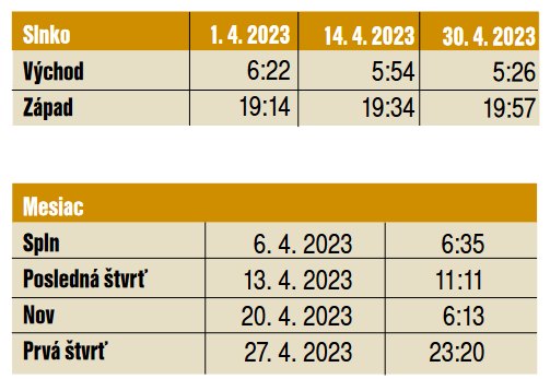 Väčšina astronomických úkazov nastane v druhej polovici apríla. Tešiť sa môžeme na výborné podmienky počas známeho meteorického roja, dve pekné konjunkcie a jedno hybridné zatmenie Slnka vo svete. Okrem iného sa pozorovateľom a fotografom začína sezóna lovenia fotografií centra našej Galaxie, ktorá sa po niekoľkých mesiacoch opäť na oblohe ukáže v celej svojej kráse.