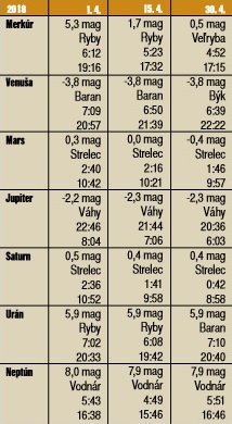 Merkúr je na začiatku apríla pre svoju blízkosť k Slnku nepozorovateľný. Situácia sa však postupom dní bude zlepšovať a od polovice mesiaca ho budeme môcť zazrieť pred východom Slnka na rannej oblohe. Nájdeme ho v súhvezdí Rýb. Venušu, naopak, môžeme vidieť na večernej oblohe po západe Slnka. Mars sa dá pozorovať v druhej polovici noci, a to od druhej rannej hodiny až do východu Slnka a 7. a 8. apríla bude spoločne so Saturnom a Mesiacom tvoriť na oblohe krásnu trojicu. Postupom dní sa bude od Saturnu čoraz viac vzďaľovať. Jupiter môžeme vidieť už od deviatej hodiny večer, neprehliadnuteľne sa vynímajúci v strede pomyselných Váh. Saturn je každým dňom pozorovateľný o čosi dlhšie. Na začiatku apríla od pol tretej ráno, na jeho konci od pol jednej v noci. Urán sa pre svoju blízkosť pri Slnku pre nás tento mesiac nedá pozorovať. A Neptún môžeme pomocou ďalekohľadu vidieť pred východom Slnka.