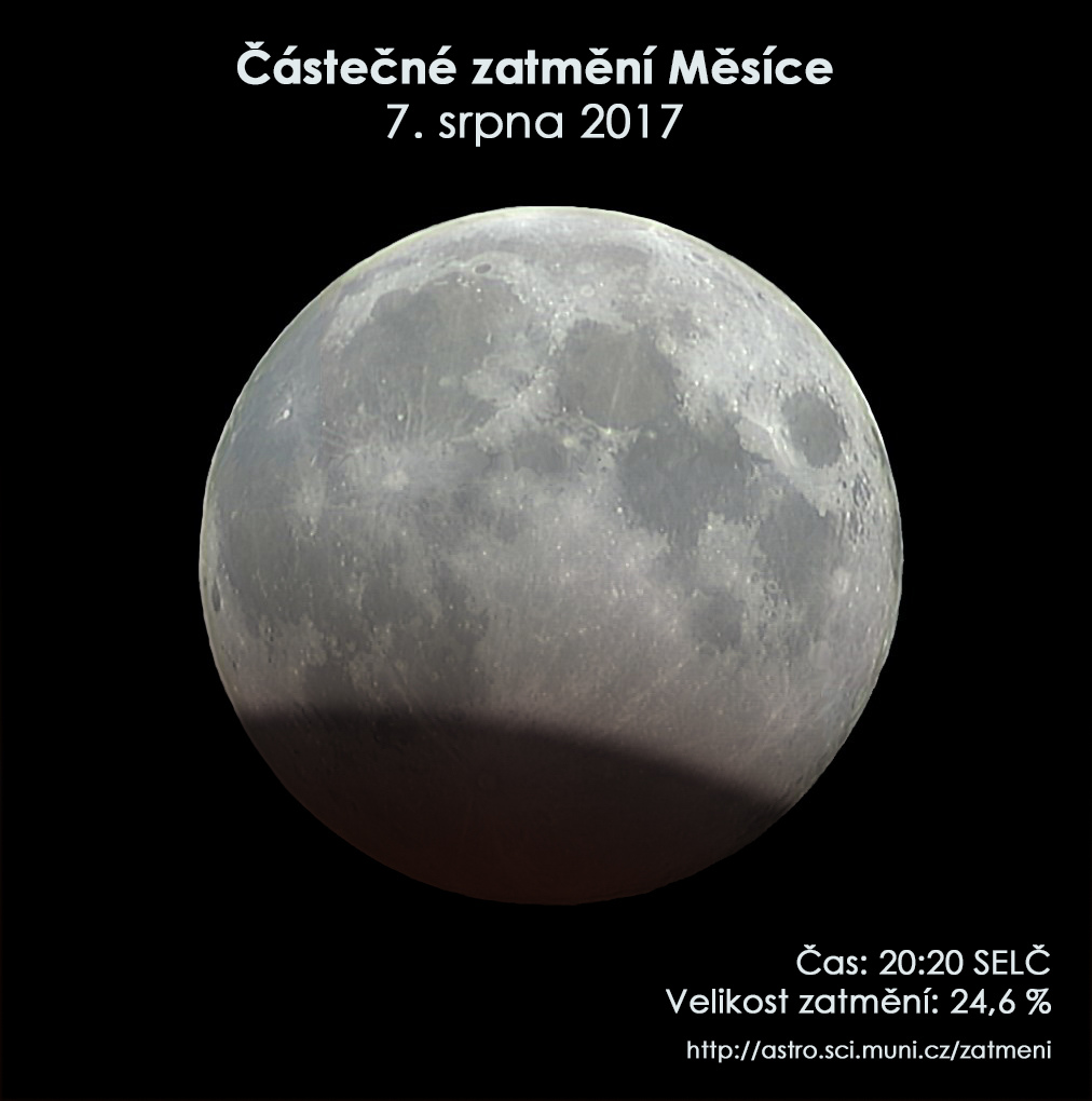 Pre obyvateľov našich zemepisných šírok je však dôležitejšou udalosťou čiastočné zatmenie Mesiaca 7. augusta viditeľné z južnej a východnej Ázie, Európy, Afriky a Austrálie. Tento úkaz bude pozorovateľný päť hodín. Začiatok nastane v popoludňajších hodinách, ale ten bude pre nás nepozorovateľný. Sledovať však môžeme maximálnu fázu zatmenia v čase okolo 20:20 h. Celý úkaz doznie o 21:18 h. Tieň Zeme si budeme môcť všimnúť na južnej časti Mesiaca. Na lepšiu ilustráciu prikladáme obrázok čiastočného zatmenia Mesiaca očakávaného v auguste