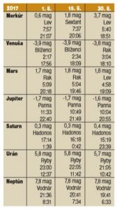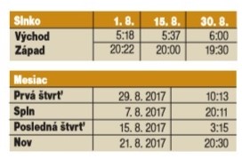 cie možnosti nám tento mesiac ponúkne urána Neptún. Dňa 3. augusta bude Urán v zastávke a na oblohe sa počas ďalších nocí začne pohybovať opačným smerom. Neptún sa 10. augusta dostane do konjunkcie s Mesiacom, nájdeme ho 0,9° severne od Mesiaca. V zastávke bude 12. augusta aj Merkúr a 25. augusta aj Saturn. Počas 25. augusta sa bude aj Merkúr nachádzať v hornej konjunkcii so Slnkom.