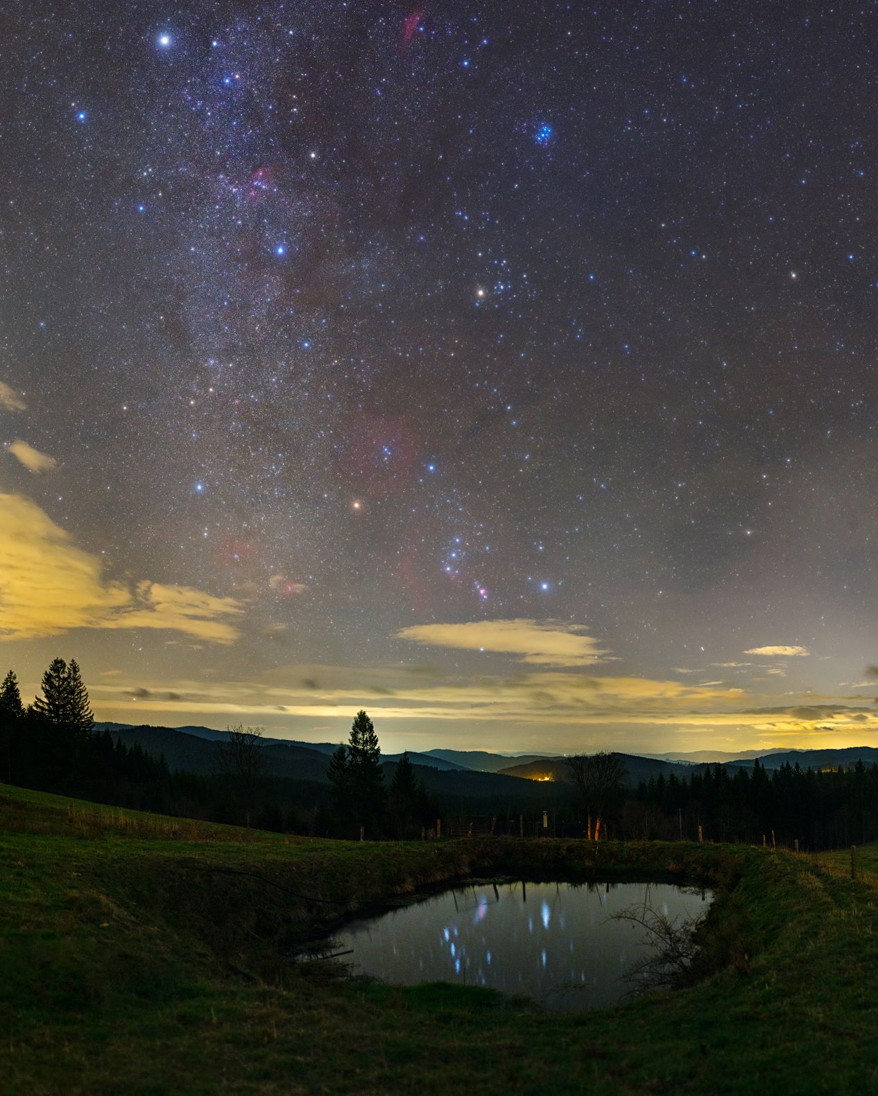 Na januárovej oblohe naďalej vyniká súhvezdie Orión. Pod ním nájdeme najjasnejšiu hviezdu severnej oblohy Sírius. Vyššie naľavo od Orióna vidíme hviezdy Castor a Pollux zo súhvezdia Blížencov.