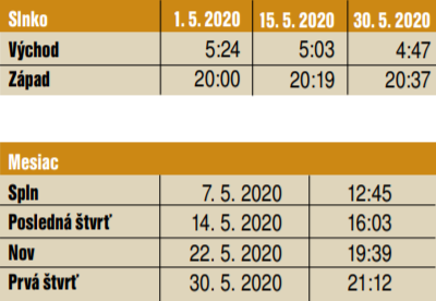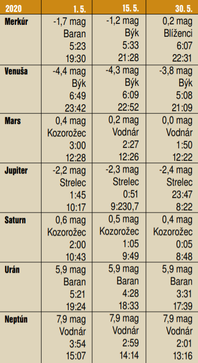 Merkúr môžeme pozorovať v druhej polovici mája po západe Slnka. Zo súhvezdia Barana sa 10. mája presunie do Býka a 29. mája vstúpi do súhvezdia Blížencov. Ešte 22. mája ho môžeme vidieť v tesnej dvojici s Venušou. Venuša sa neprehliadnuteľne vyníma na večernej oblohe. Pozorovať ju môžeme po západe Slnka. Nachádza sa v súhvezdí Býka. Mars vychádza v druhej polovici noci a pozorovateľný zostáva, až pokým ho neprežiaria slnečné lúče. Nájdeme ho v súhvezdí Kozorožca, 9. mája v súhvezdí Vodnára. Aj Jupiter môžeme vidieť počas druhej polovice noci. Každým dňom vychádza o čosi skôr, takže čas na jeho pozorovanie sa nám predlžuje. Nájdeme ho v súhvezdí Strelca, počas prvých májových nocí od druhej hodiny v noci, na konci mesiaca od polnoci. Aj Saturn je pozorovateľný v druhej polovici noci. Nachádza sa v súhvezdí Kozorožca. Vidieť ho môžeme od druhej v noci, na záver mája od polnoci. Urán môžeme pozorovať na skorej rannej oblohe. Nájdeme ho v súhvezdí Barana. Neptún môžeme pomocou ďalekohľadu taktiež vidieť pred východom Slnka. Nájdeme ho v súhvezdí Vodnára.