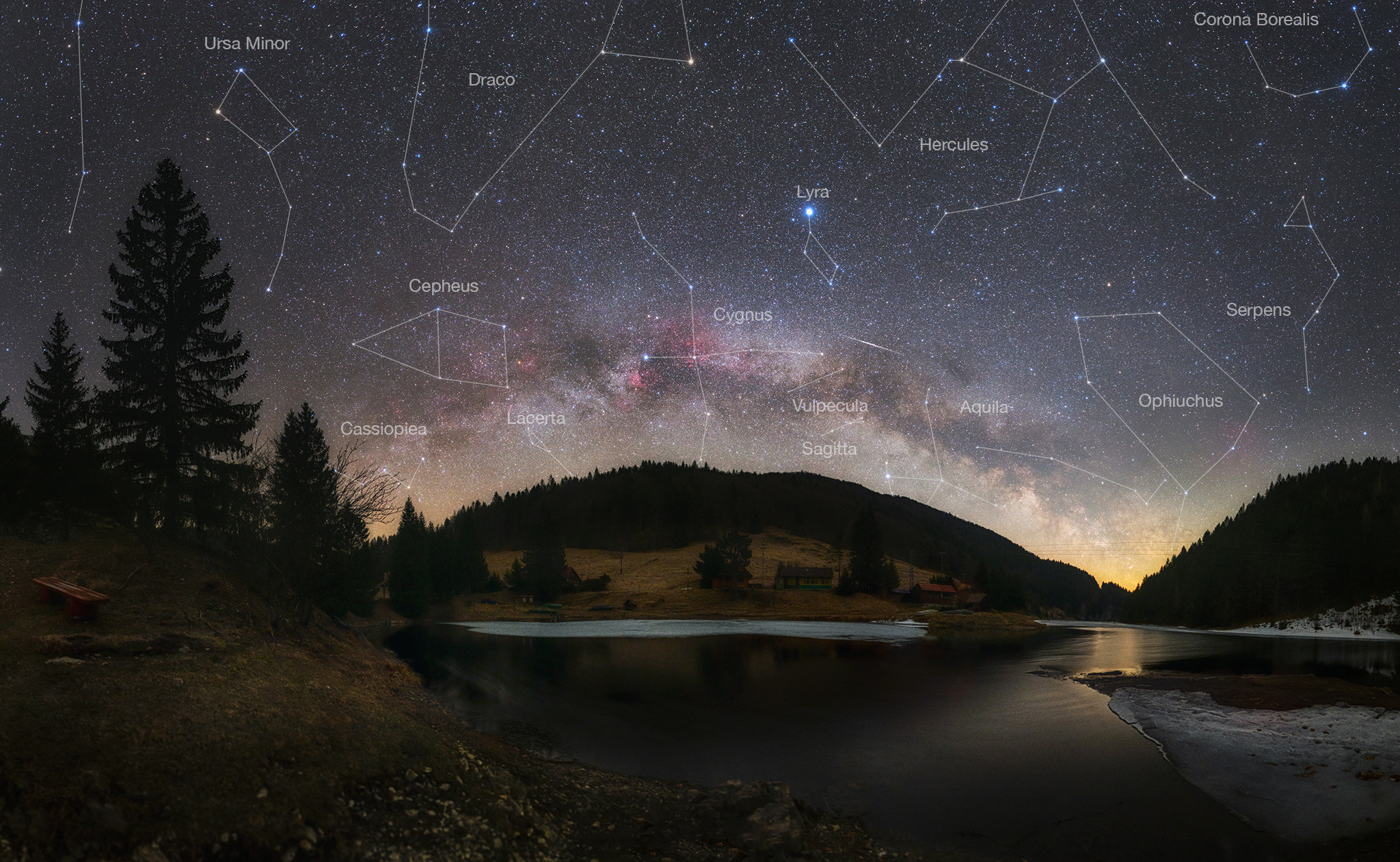 Na severnej pologuli sa blíži leto. Na severovýchode môžeme vidieť vychádzať súhvezdie Lýra s najjasnejšou hviezdou Vega. Nad severným obzorom vidíme písmeno W – súhvezdie Kasiopeja. Medzi Kasiopejou a Polárkou v Malej medvedici nájdeme súhvezdie Cefeus.