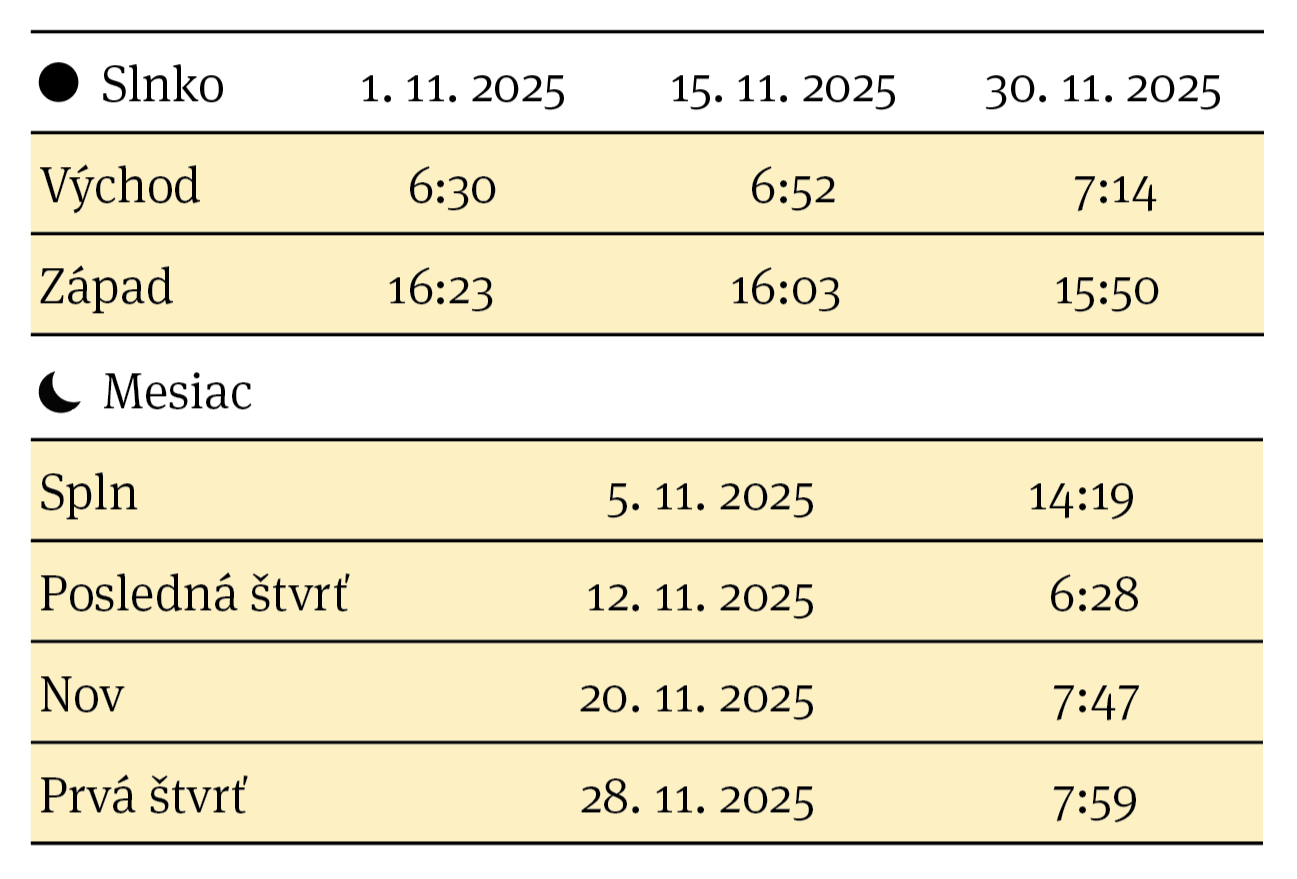 Začiatkom novembra očakávajte meteorický roj Tauridy, ktorý má dve hlavné vetvy. V stredu 5. novembra nastane spln Mesiaca. Približne v polovici mesiaca vrcholí meteorický roj Leonidy a čakajú nás aj dve konjunkcie Mesiaca a planét.