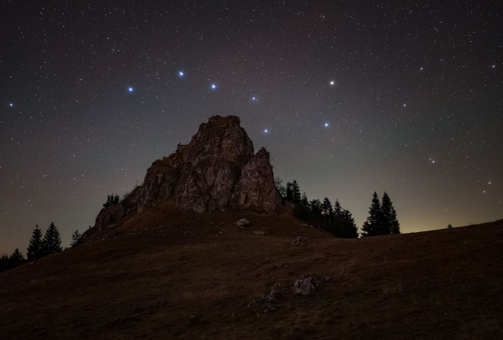 Október je vhodným mesiacom na pozorovanie zodiakálneho svetla a protisvitu, ktorý sa dostane vysoko na oblohu. Pokochať sa však môžeme aj zapadajúcim Letným trojuholníkom, Veľkým vozom kolmo nad obzorom či galaxiou v súhvezdí Andromeda. Na snímke je asterizmus Veľký voz nad Kráľovou skalou v Parku tmavej oblohy Veľká Fatra, foto Tomáš Slovinský.