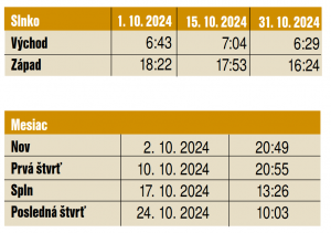 Ako sme už naznačovali v septembrovom astrokalendáriu, na oblohe sa črtá zaujímavá udalosť. Má ňou byť kométa s názvom C/2023 A3 Tsuchinshan-ATLAS. Prvotné výpočty predpovedali jasnosť na úrovni známej kométy Neowise z roku 2020. Neskoršie predpovede naznačovali pokles jasnosti spôsobený rozpadom kometárneho jadra, čo sa neskôr vyvrátilo. Vo chvíli tvorby článku kométa vyzerá nádejne a v októbri by sme ju mohli vidieť hneď začiatkom mesiaca nad východným obzorom pred východom Slnka. Neskôr, v priebehu mesiaca sa dostane na večernú oblohu nad západný obzor. Pre viac aktuálnych informácií odporúčame sledovať rôzne astronomické stránky a skupiny poskytujúce upozornenia.