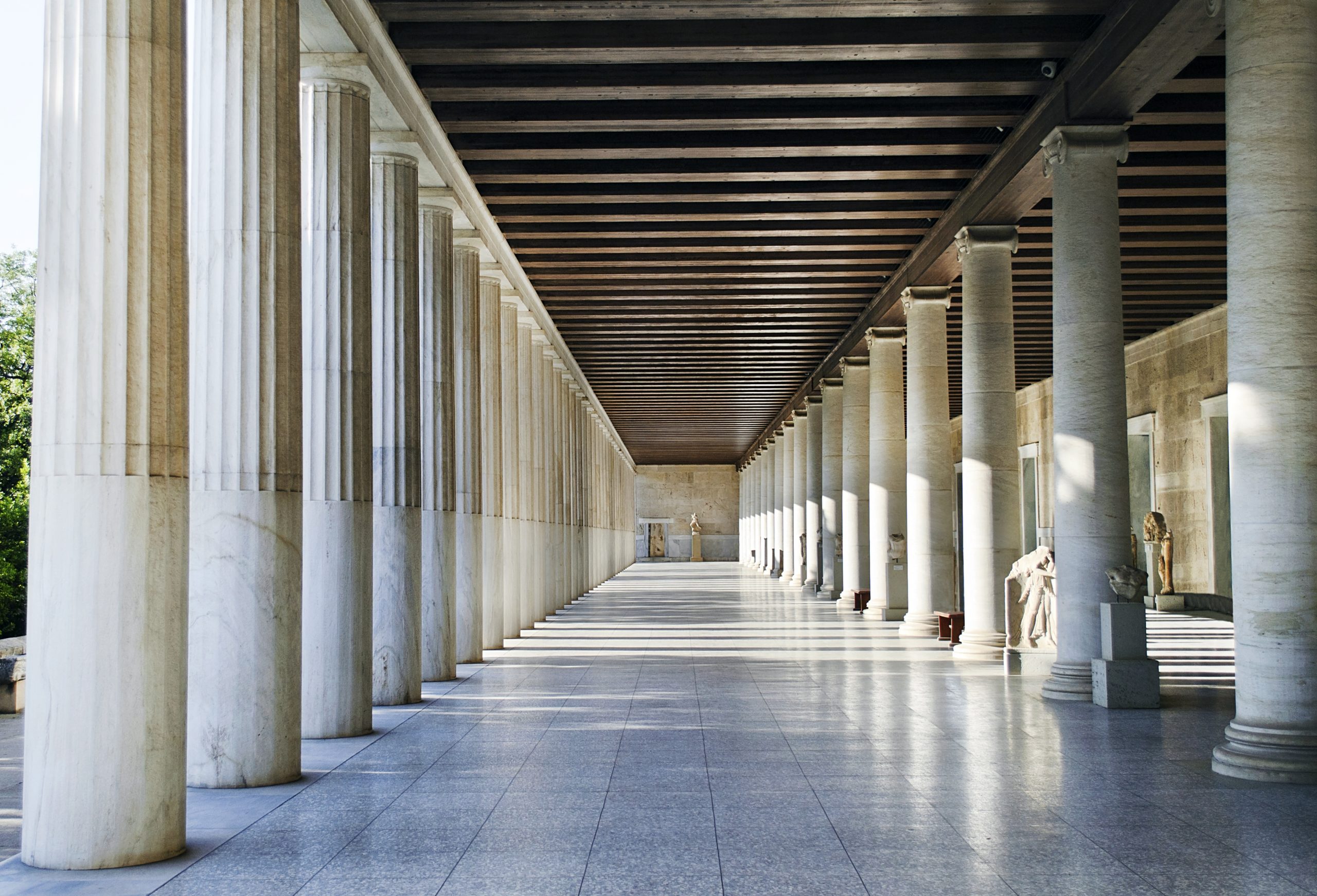 Tradičná budova v gréckom štýle s otvorenými stenami a stĺpmi