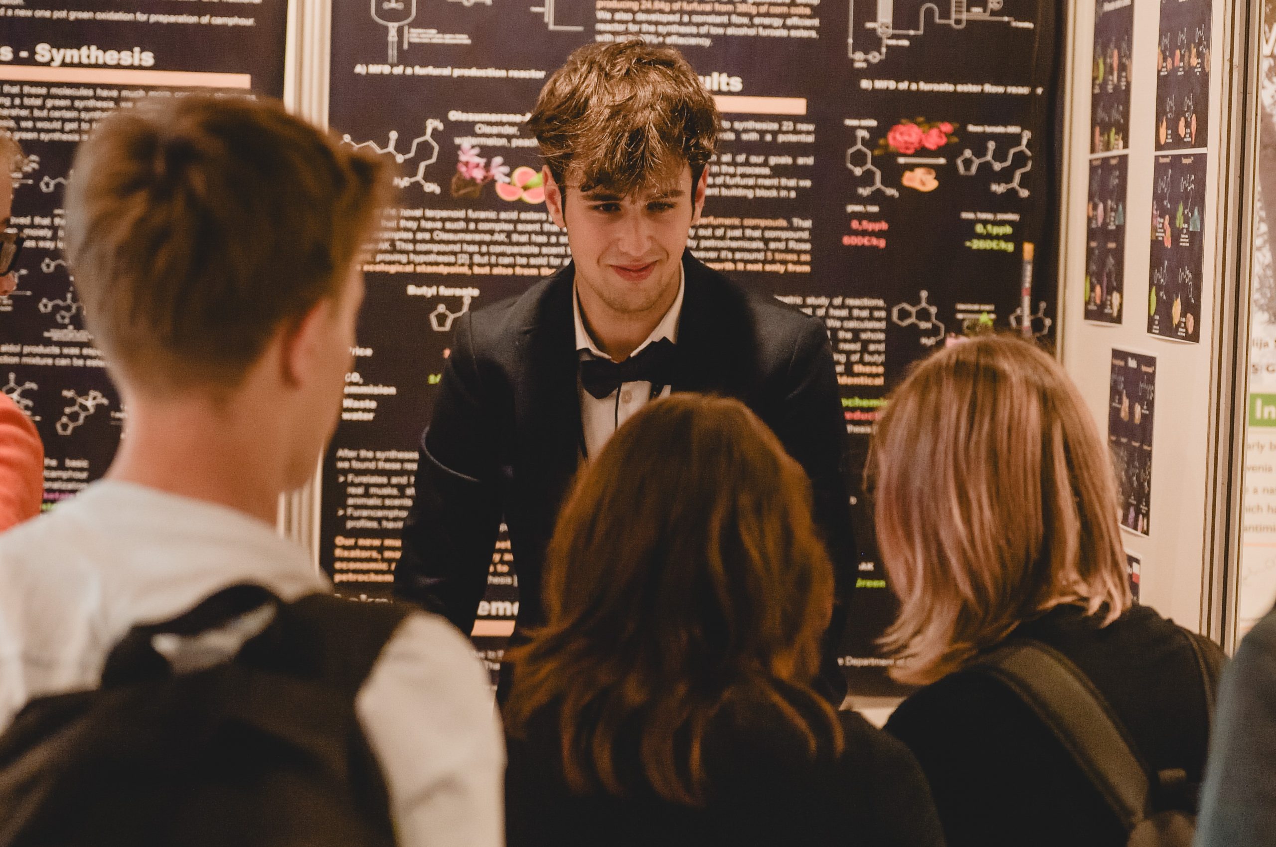 Mladý muž v obleku hovorí s mladými ľuďmi