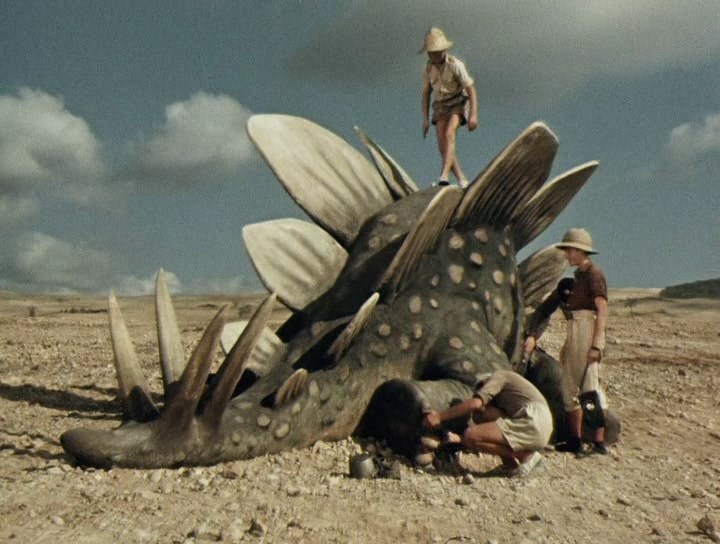 Rekonštrukcia stegosaura v reálnej veľkosti, okolo neho stoja chlapci