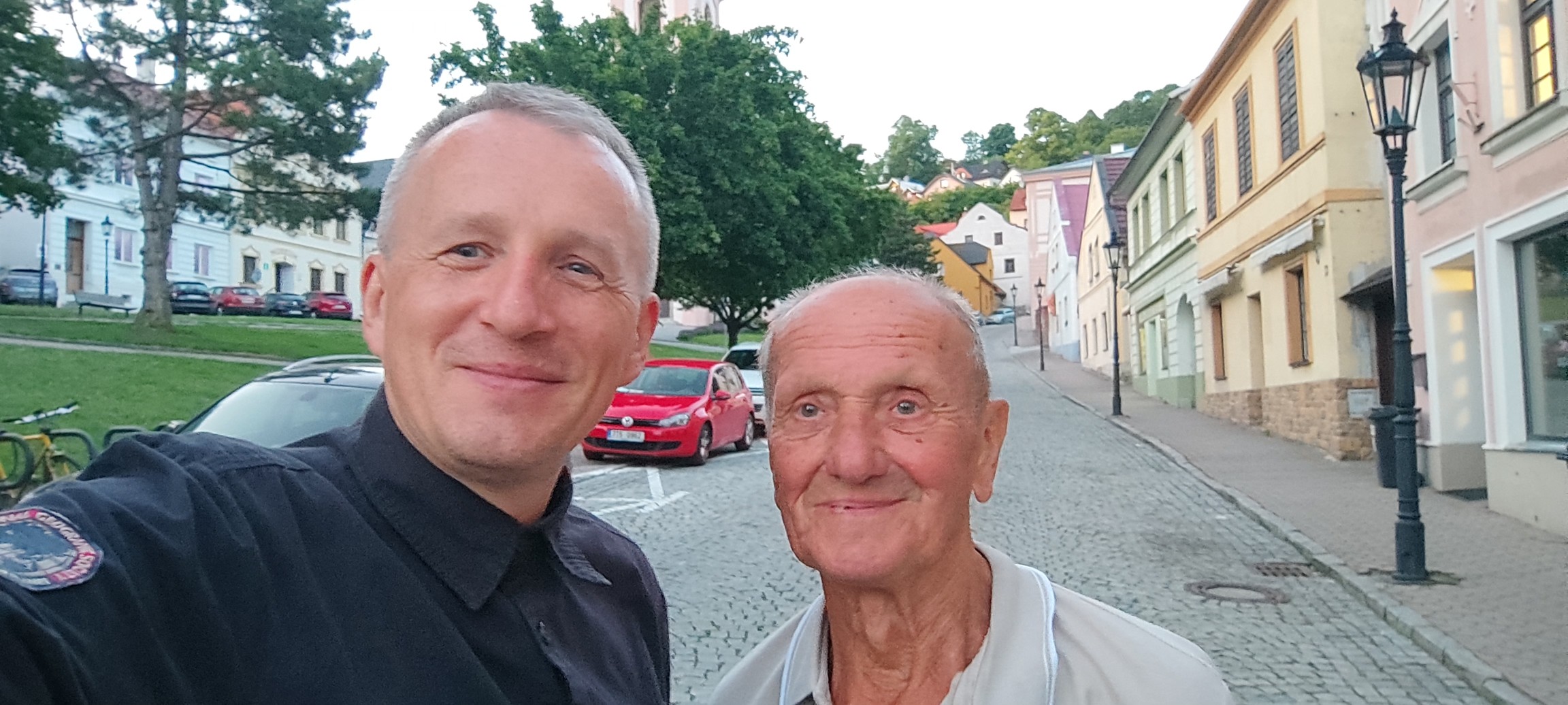 Selfie fotka dvoch mužov, jeden z nich je senior