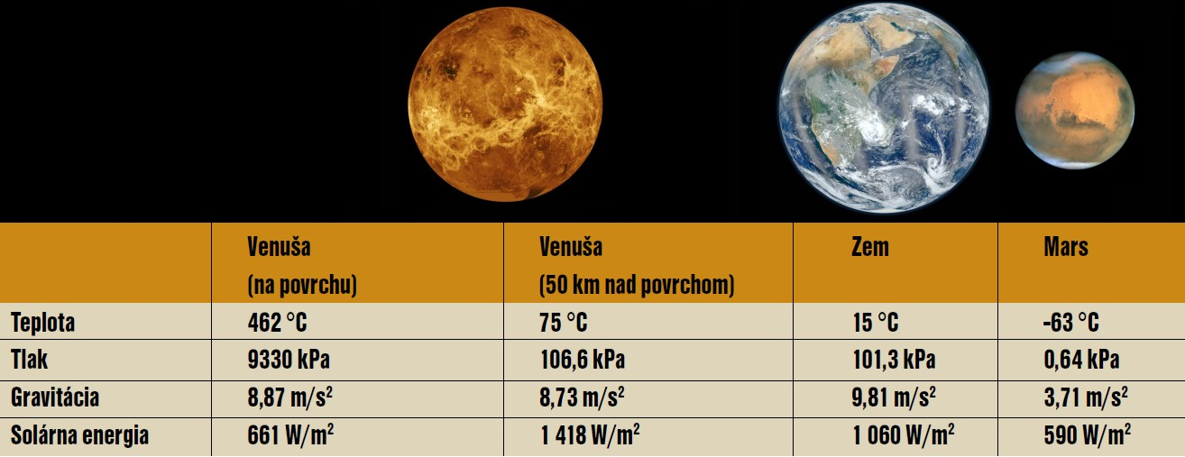 Skúsme sa presunúť trochu vyššie, približne do výšky 50 kilometrov nad povrch Venuše. Vyzerá to tam takmer dokonale. Teplota sa pohybuje od 30 do 70 stupňov Celzia, atmosférický tlak sa takmer rovná tomu zemskému, podobne ako atmosférická ochrana proti radiácii. Prší tam síce kyselina sírová, preto by ľudia potrebovali kyslíkové masky a ochranné oblečenie, ale určite nie vesmírny skafander.