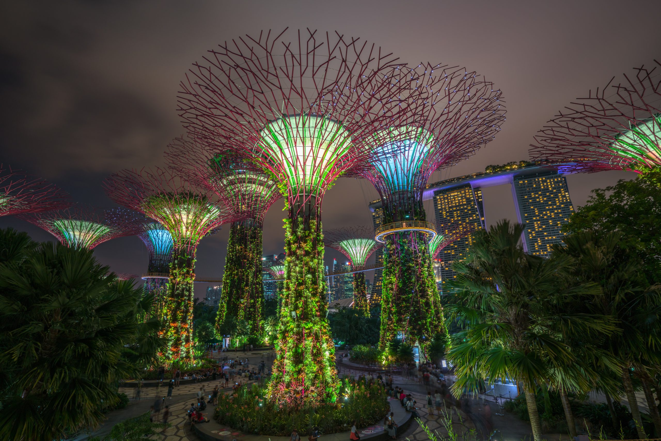 Osvetlené konštrukcie stromov obrastené vegetáciou