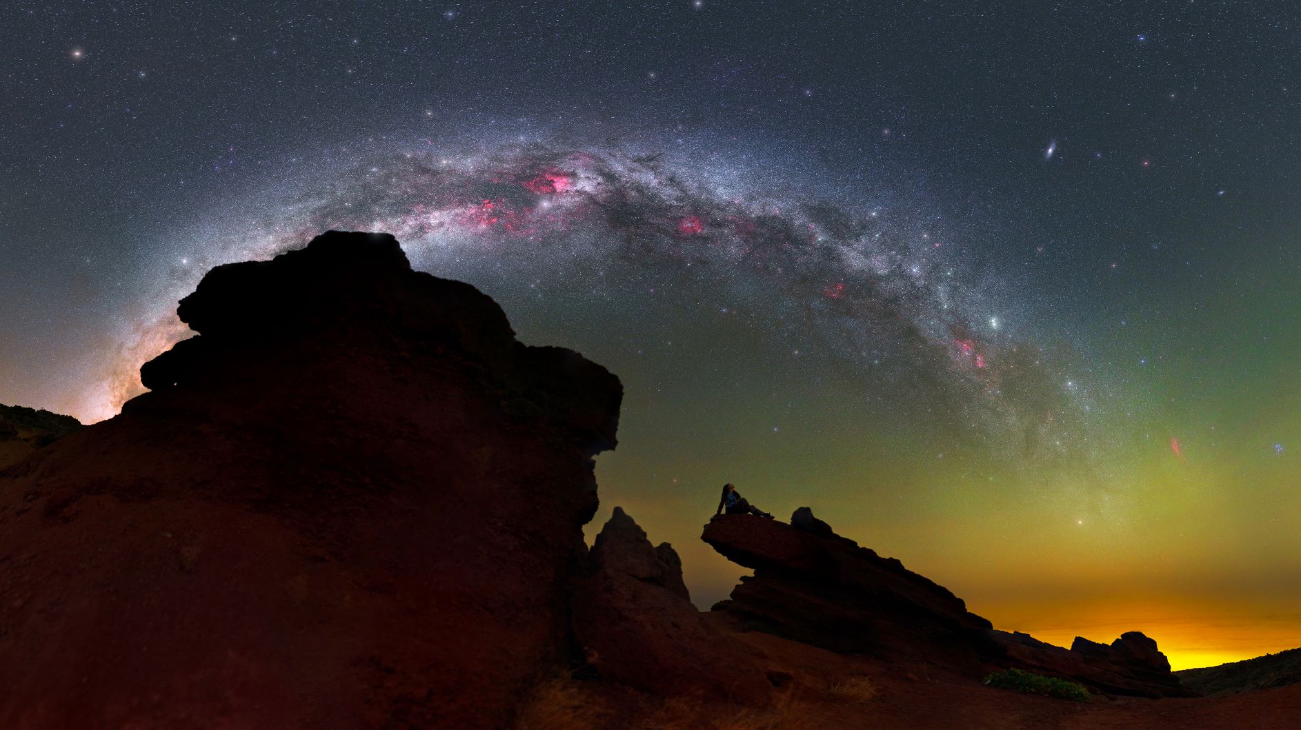 Strechy kupol sa pomaly odkrývajú, rádioteleskopy sa pohybujú a pracovníci observatórií sú pripravení začať počas noci svoj ďalší dobrodružný pracovný deň. Hviezdy a planéty sú tu po súmraku jasnejšie než na miestach s väčším svetelným znečistením. Nie je teda problém rozpoznať slabšie súhvezdia či galaxiu Mliečna cesta, ktorá sa tiahne naprieč celou oblohou. Galaktické jadro spolu s jasnou planétou Jupiter v noci jemne osvetľujú krajinu. Voľným okom taktiež pozorujeme difúzny objekt – galaxiu M31 v súhvezdí Andromeda. Okrem dominantnej nočnej oblohy senzor fotoaparátu zachytil aj jeden zaujímavý jav. Ide o prirodzené žiarenie atmosféry (airglow), ktoré vzniká počas dňa, keď ultrafialové žiarenie ionizuje kyslík alebo dusík vo vysokých vrstvách atmosféry, vo výške 100 až 300 km, pričom zelené žiarenie vzniká vo výške okolo 100 km a červené vo výške okolo 150 až 300 km. V tomto prípade to síce nebolo veľmi silné žiarenie, no tento fenomén sa na fotografii podpísal do zelena sfarbeným pozadím.