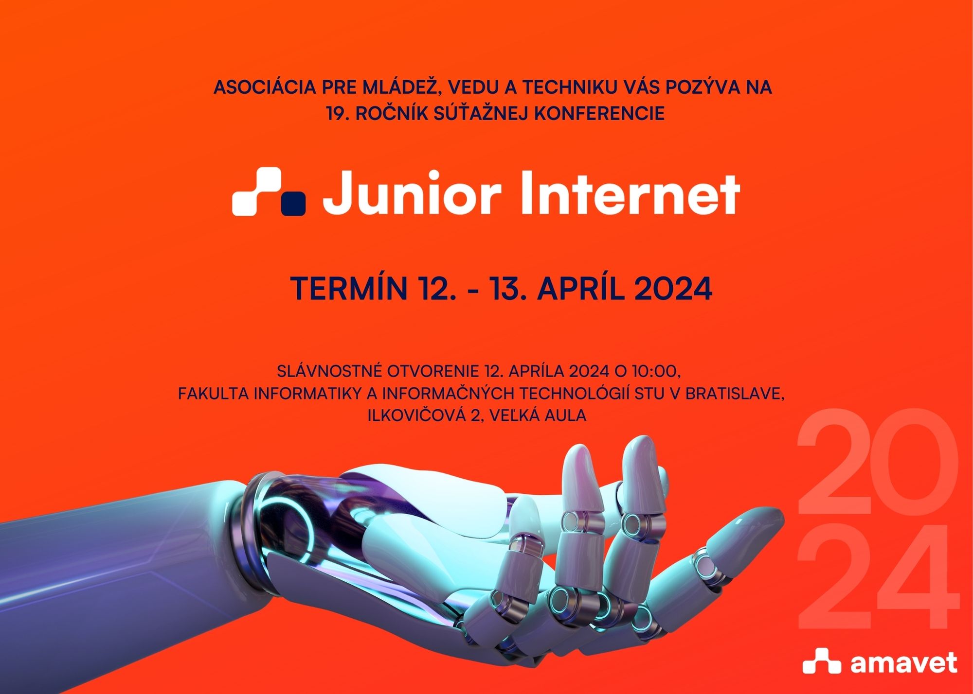 Súťažná konferencia Junior Internet AMAVET má v tomto roku pred sebou už 19. ročník. Uskutoční sa 12. až 13. apríla na Fakulte informatiky a informačných technológií (FIIT) STU v Bratislave. Tento ročník sľubuje bohatý program a prezentáciu inovatívnych projektov, ktoré boli vybrané z pôvodného počtu 136 prihlásených prác. Na konferencii budú žiaci základných a najmä stredných škôl z celého Slovenska prezentovať 43 projektov, ktoré postúpili z prvého kola hodnotenia.