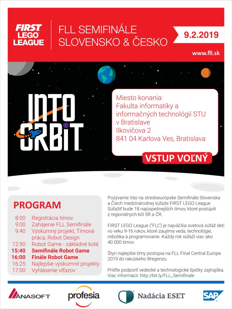 V sobotu 9. februára 2019 sa na pôde Fakulty informatiky a informačných technológií (FIIT) STU v Bratislave stretnú víťazné tímy regionálnych kôl najväčšej medzinárodnej robotickej súťaže pre deti vo veku od 9 do 16 rokov zo Slovenska a Českej republiky. Na turnaji FLL Semifinále Slovensko & Česko si zmerajú zmerajú svoje sily, aby zabojovali o postup medzi 4 tímy, ktoré nastúpia na FLL Finále Strednej Európy v rakúskom meste Bregenz v dňoch 29. až 30. marca 2019.