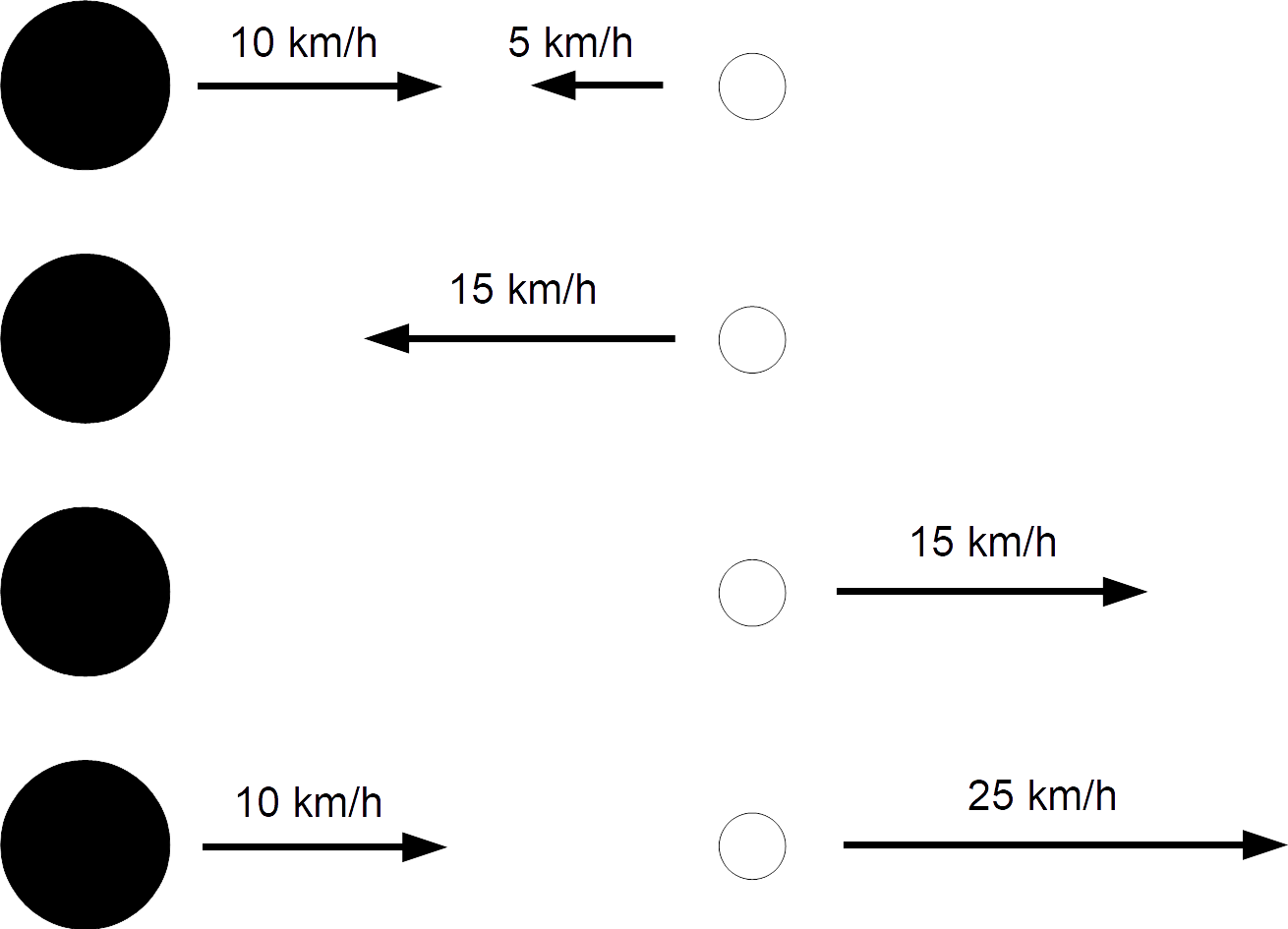 Predstavte si veľmi ťažké teleso, napríklad bowlingovú guľu, a veľmi ľahké teleso, napríklad pingpongovú loptičku, ako idú proti sebe a zrazia sa. Ťažká guľa si túto malichernosť ani nevšimne a celý čas sa bude pohybovať rovnako rýchlo. Z pohľadu ľahkej loptičky to však vyzerá tak, že sa k nej ťažká guľa približuje veľkou rýchlosťou. Po pružnej zrážke sa bude touto rýchlosťou od nej vzďaľovať a keď sa vrátime do pohľadu, v ktorom sa hýbe bowlingová guľa konštantou rýchlosťou, pingpongová loptička si zrazu odniesla okrem svojej pôvodnej rýchlosti dvojnásobok rýchlosti ťažkého telesa. V skutočnosti je to teda tak, že pri zrážke veľmi malú časť svojej energie veľké teleso stratí a malé ju získa. Pre veľké teleso je táto strata zanedbateľná, no pre to malé má veľké dôsledky.