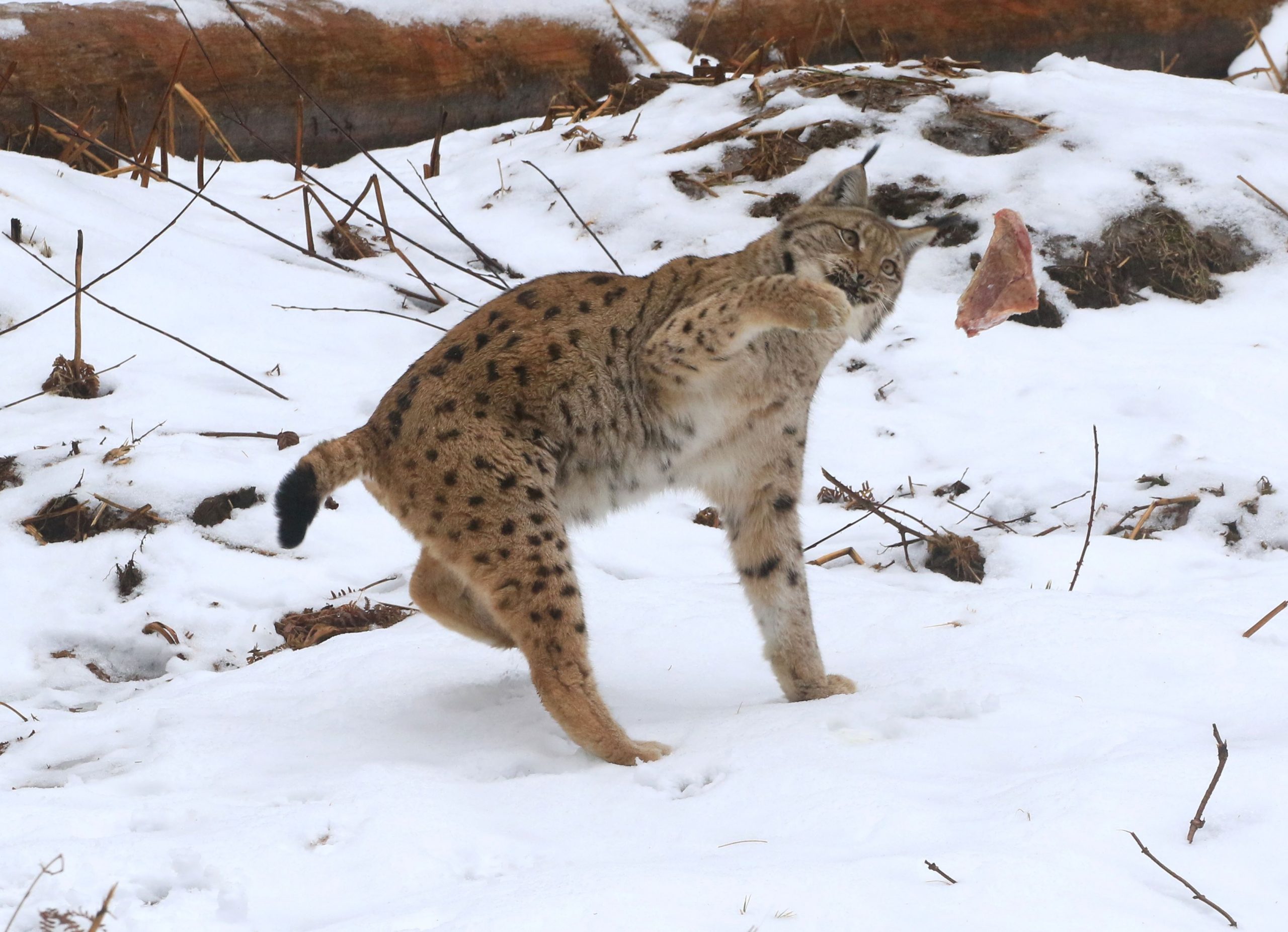 Rys prehadzuje kus mäsa prednými labami.