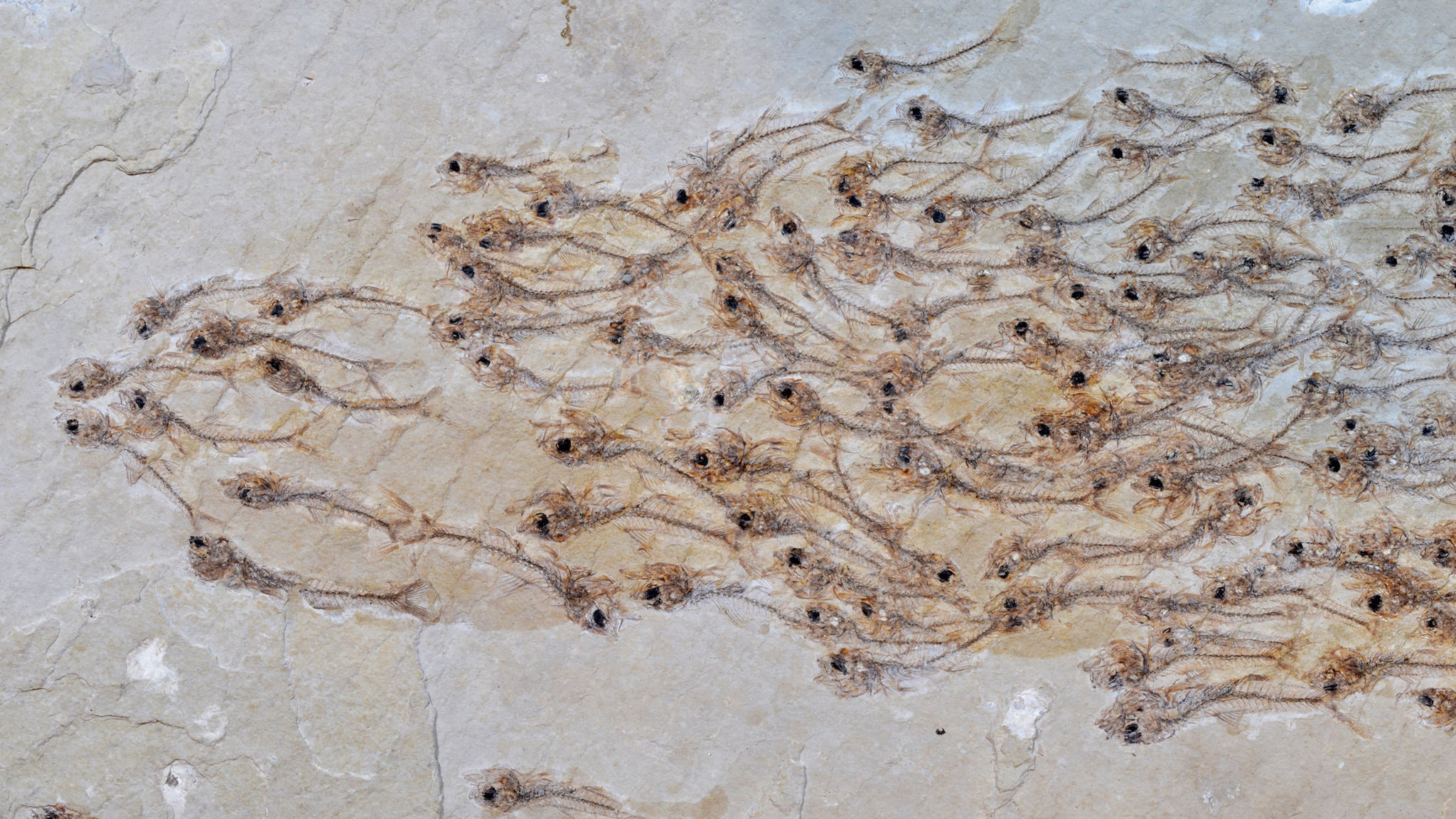 Každá starodávna fosília môže byť výnimočným darom z bohatej histórie našej planéty. Takýmto je aj nález vápencovej dosky z obdobia eocénu, ktorú v roku 2016 objavil behaviorálny ekológ Arizonskej štátnej univerzity Nobuaki Mizumoto v múzeu v Katsuyame v Japonsku. Doska sa stala miestom posledného odpočinku až neuveriteľných 259 rýb vyhynutého druhu Erismatopterus levatus. Fosilizované ryby sú zachytené uprostred plávania, zjavne rovnakým smerom, a tak ponúkajú jedinečný pohľad na správanie sa vymretých druhov spred 50 miliónov rokov. Tieto ryby žili v horských jazerách v oblasti Green River v západnej časti USA. Dospelý E. levatus bol asi 6,5 cm dlhý, ale vápencová doska je plná rybích mláďat veľkých asi 20 mm. Zdá sa, že rybiemu húfu sa stala osudnou kolabujúca duna piesku, ktorá sa náhle zosypala a pochovala všetko živé. Analýza pozícií rýb a ich orientácií naznačuje, že sa mláďatá učili riadiť rovnakými pravidlami príťažlivosti a odporu ako húfy súčasných rýb – ryby sú odpudzované od svojich najbližších susedov, aby sa vyhli kolíziám, ale držia sa skupiny sledovaním najvzdialenejšej ryby. Pretože kolektívne správanie je pozorované pri mnohých zvieratách vrátane usporadúvania sa do kŕdľov vtákov alebo rojenia hmyzu, vedci si myslia, že takéto správanie sa vyvinulo už dávno. Doteraz však o tom bolo len málo dôkazov pri vyhynutých druhoch, hovorí N. Mizumoto.