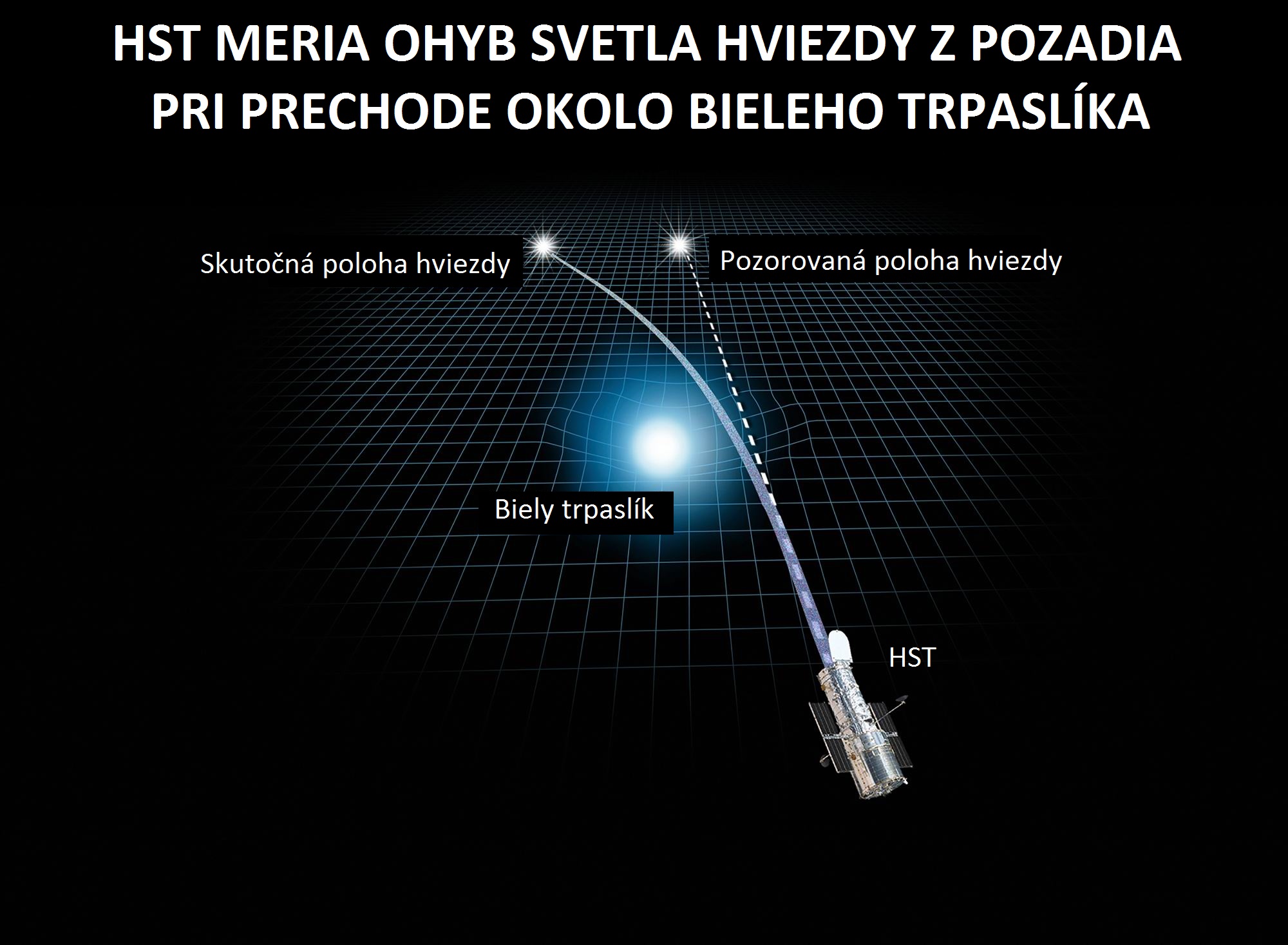 Vedci museli čakať celé storočie na dostatočne výkonné ďalekohľady, ktoré sú schopné zachytiť jav zakrivenia lúča svetla vplyvom gravitačného poľa hviezdy mimo Slnečnej sústavy. Ohyb svetla je taký nepatrný, že ho zatiaľ dokáže odhaliť len ostré oko Hubblovho kozmického ďalekohľadu. HST pozoroval blízku hviezdu – bieleho trpaslíka – označenú Stein 2051 B, ako prechádza popred hviezdu v pozadí. Počas tesného zoradenia na oblohe biely trpaslík svojou gravitáciou ohol svetlo vzdialenej hviezdy, čím sa táto hviezda zdanlivo ocitla asi dve oblúkové milisekundy (t. j. 0,002 oblúkovej sekundy) od svojej skutočnej polohy. Táto odchýlka je taká malá, že je ekvivalentná pozorovaniu mravca lezúceho po povrchu papiera zo vzdialenosti 2400 km. Využitím tohto merania ohybu svetla astronómovia vypočítali, že hmotnosť bieleho trpaslíka je približne 0,68 hmotnosti nášho Slnka. Výsledok súhlasí veľmi dobre s teoretickými predpoveďami. Táto metóda otvára nové možnosti určovania hmotností hviezd.