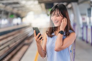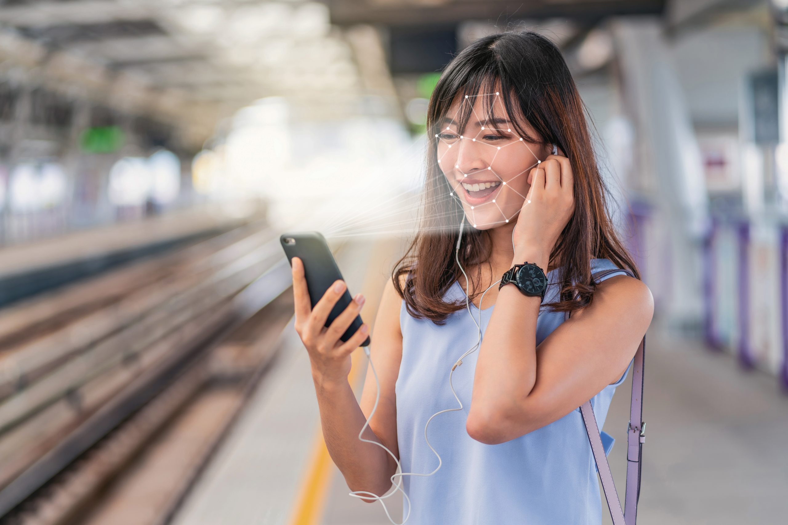 Asian woman using face recognition via smart mobile phone and listening the music at Railroad Station Platform, Biometric Verification and artificial intelligence concept