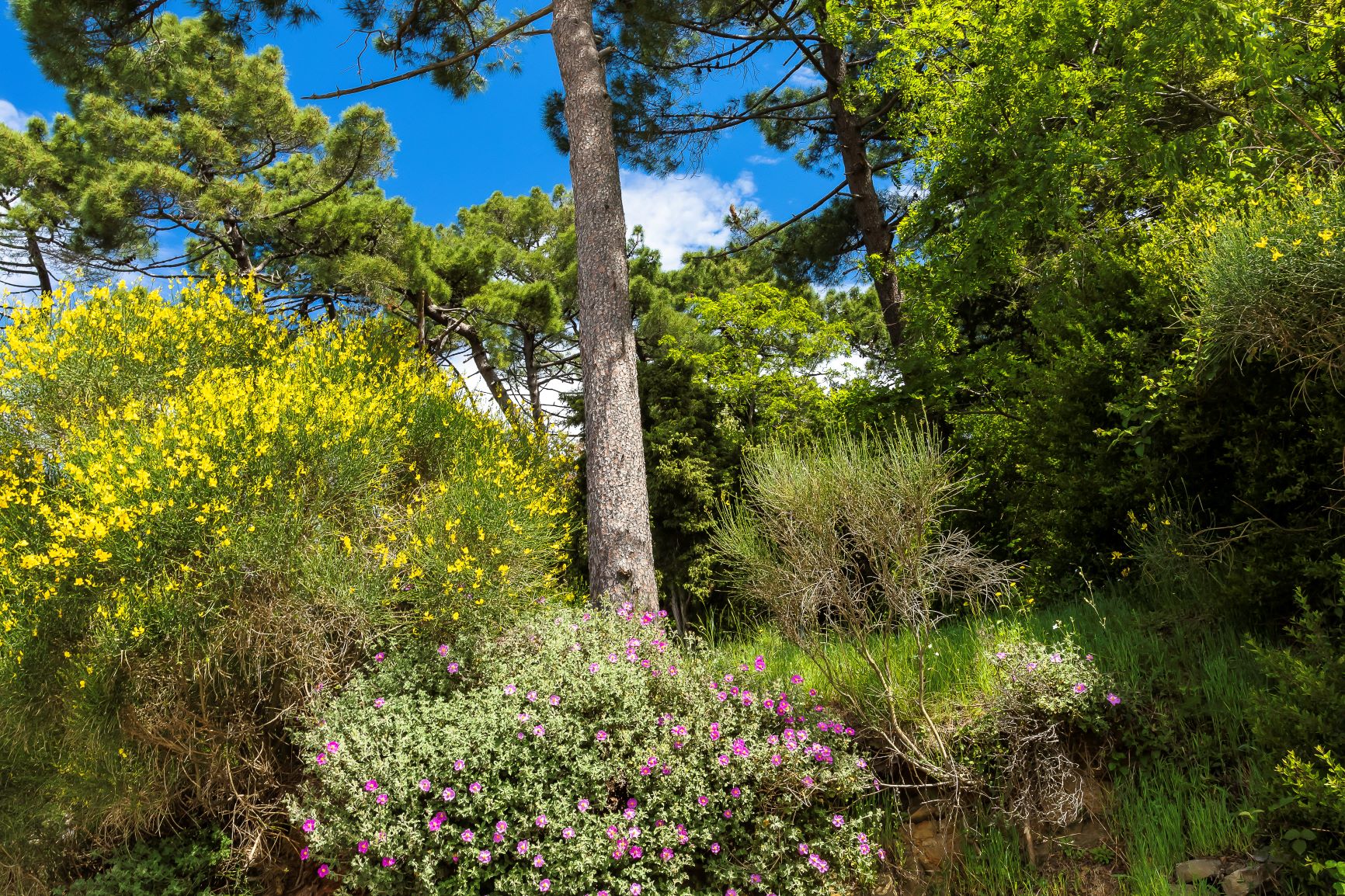 (Pinus halepensis), rozkvitnutým cistusom Cistus incanus s ružovými kvetmi a žltokvitnúcim spartiom Spartium junceum