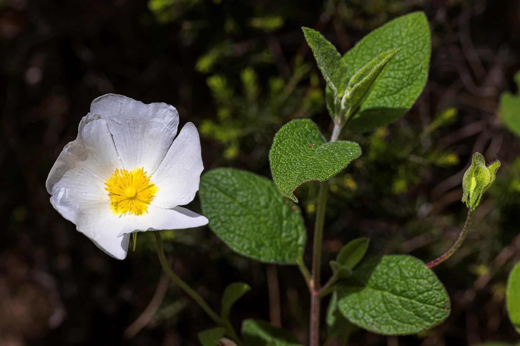 Bielo kvitnúci cistus šalviolistý (Cistus salvifolius) kvitne len v jarnom období. Jeho listy pripomínajú listy šalvie. Je to poloker až ker s výškou 30 – 60 cm. Krása jeho kvetov, ktorá nás upúta už z diaľky, vynikne ráno a dopoludnia, ale neskôr, najmä za horúceho slnečného počasia, lupienky kvetov rýchlo opadávajú na zem. Je súčasťou porastov makchie, garrigue, ale aj frygany vo východnom Stredomorí. Najskôr by sme ho mohli vidieť na piesčitých pobrežiach, pri plážach a na dunách v súvislejšie zapojenom bylinnom poraste.