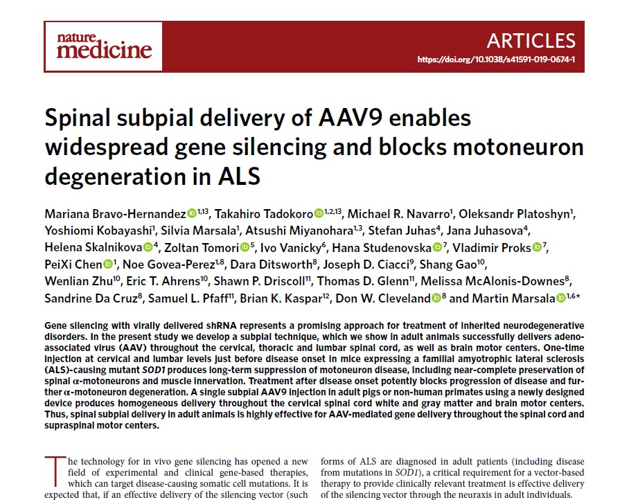 Originalita tejto štúdie je v novom prístupe, ako účinne podať vírus, ktorý dokáže vypnúť gén spôsobujúci ALS. V súčasnosti poskytuje tento terapeutický prístup najúčinnejšiu terapiu, aká sa kedy preukázala na myších modeloch ALS spojených s mutovaným génom SOD1, uviedol hlavný autor Martin Maršala. Okrem toho účinnosť takejto liečby u dospelých zvierat naznačuje, že nový spôsob podávania liečby by mohol byť účinný aj pri liečbe iných neurodegeneratívnych porúch, kde je potrebné dopraviť génovú terapiu do tkaniva miechy, povedal Martin Maršala.