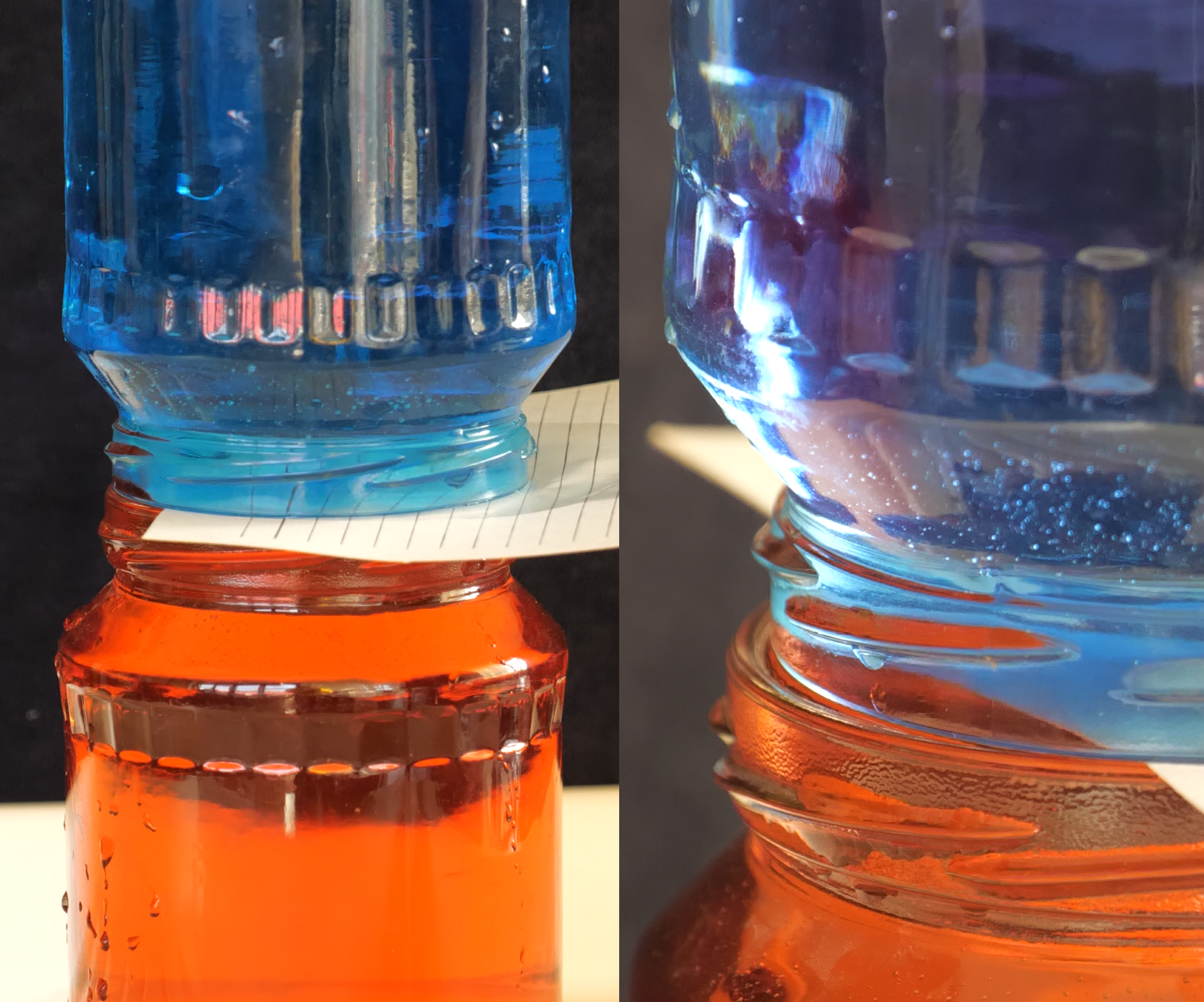 Oba poháre naplníme po okraj vodou – jeden pohár studenou a jeden teplou. Ak chceme zvýrazniť rozdielnu teplotu vody, môžeme pridať potravinárske farbivo. My sme studenú vodu zafarbili namodro a teplú načerveno.