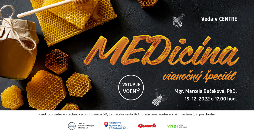 Jednou z potravín, ktoré hojne používame v našej kuchyni, je vzácny produkt včiel – med. Môže pomáhať napríklad pri hojení rán, popálenín, ale aj v liečbe bakteriálnych a vírusových infekcií. Jeho jedinečné zloženie má totiž liečivé účinky. Aký je rozdiel medzi medom z mesta a medom z vidieka? Ako vieme rozoznať kvalitný med od menej kvalitného? Čo sa stane s prospešnými látkami v mede, ak ho zamiešame do horúceho čaju? O mede a jeho využití v medicíne sa bude rozprávať v decembrovej Vede v CENTRE vo štvrtok 15. decembra 2022 o 17.00 h v CVTI SR na Lamačskej ceste 8/A v Bratislave. Môžete sa tešiť aj na ochutnávku rôznych druhov medu. Hosťom vianočného špeciálu bude Marcela Bučeková z Ústavu molekulárnej biológie SAV, v. v. i.
