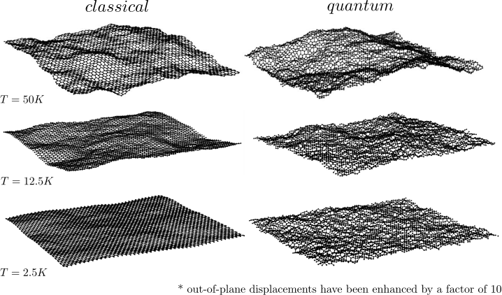 Tepelný pohyb atómov pri ľubovoľnej teplote je príčinou, že dvojrozmerná membrána grafénu nie je rovná, ale zvlnená, a to tým väčšmi, čím vyššia je teplota. Grafén preto nikdy nie je úplne plochý, bez vĺn. Čo sa však stane pri veľmi nízkej teplote, keď tepelný pohyb takmer zanikne? Už približne sto rokov vedci vedia, že svet atómov sa neriadi klasickou fyzikou. V mikrosvete platí kvantová mechanika a tá hovorí, že atómom nemožno zobrať tzv. nulové kmity. V klasickom svete by atóm zbavený tepelného pohybu ostal stáť na presne definovanom mieste a atómy v graféne by tvorili presné pravidelné šesťuholníky. V kvantovom svete sa však atómy trasú a nútia grafén, aby sa zvlnil, a to aj bez akéhokoľvek tepelného pohybu. Mgr. Juraj Hašík vo svojej diplomovej práci z roku 2015 pod vedením profesora R. Martoňáka skúmal, ako tieto kvantové vlny v graféne vznikajú a či je možné ich merať. Pre grafén implementoval, naprogramoval a otestoval kvantovú metódu Monte Carlo, ktorá je založená na tzv. dráhových integráloch. Vo svojom výskume pokračoval aj počas doktorandského štúdia na Medzinárodnej škole pre pokročilé štúdiá v Terste, kde spolupracoval s profesorom Eriom Tosattim.