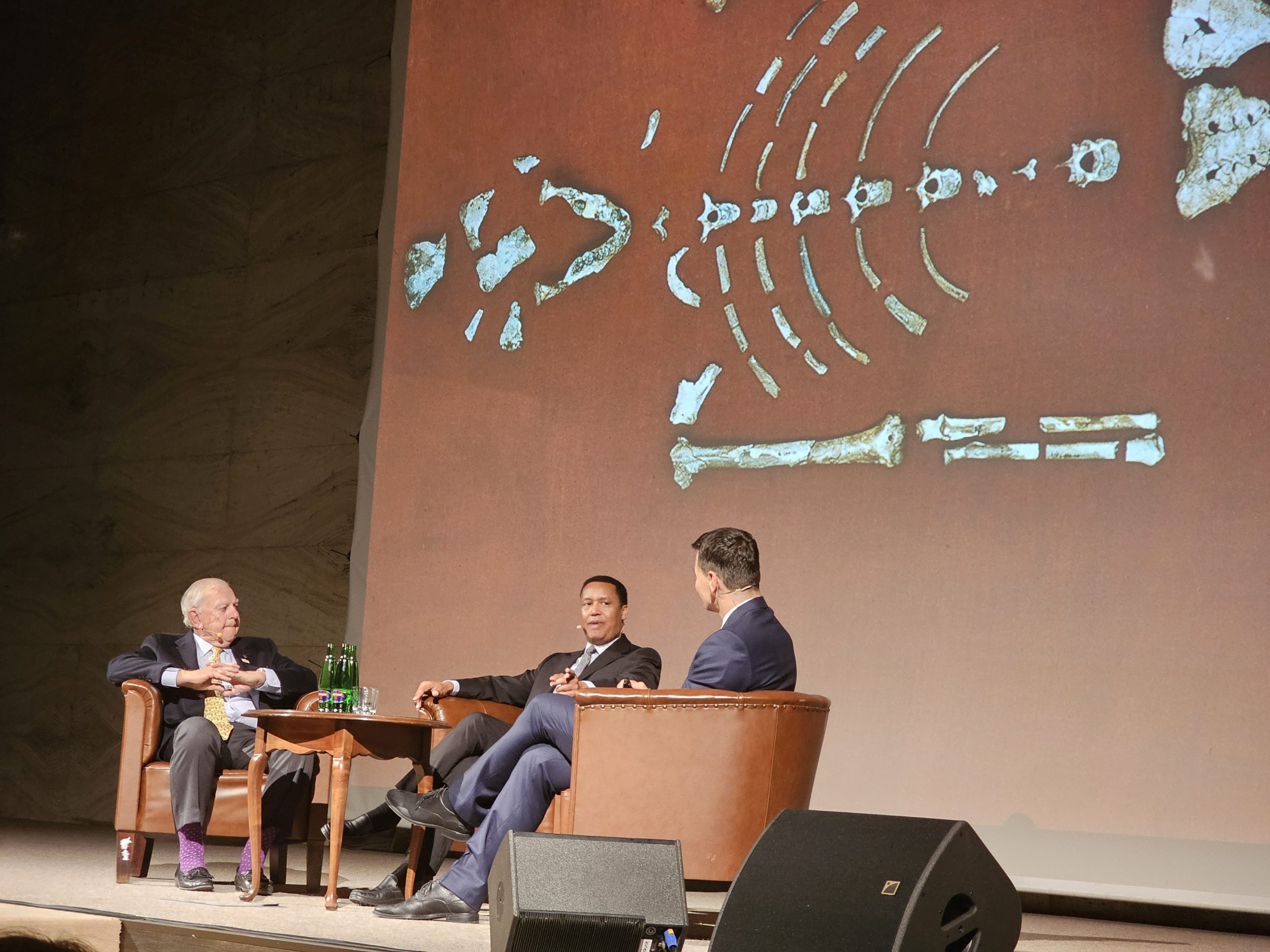Diskusia s výskumníkmi, v pozadí na plátne vidieť ich objav