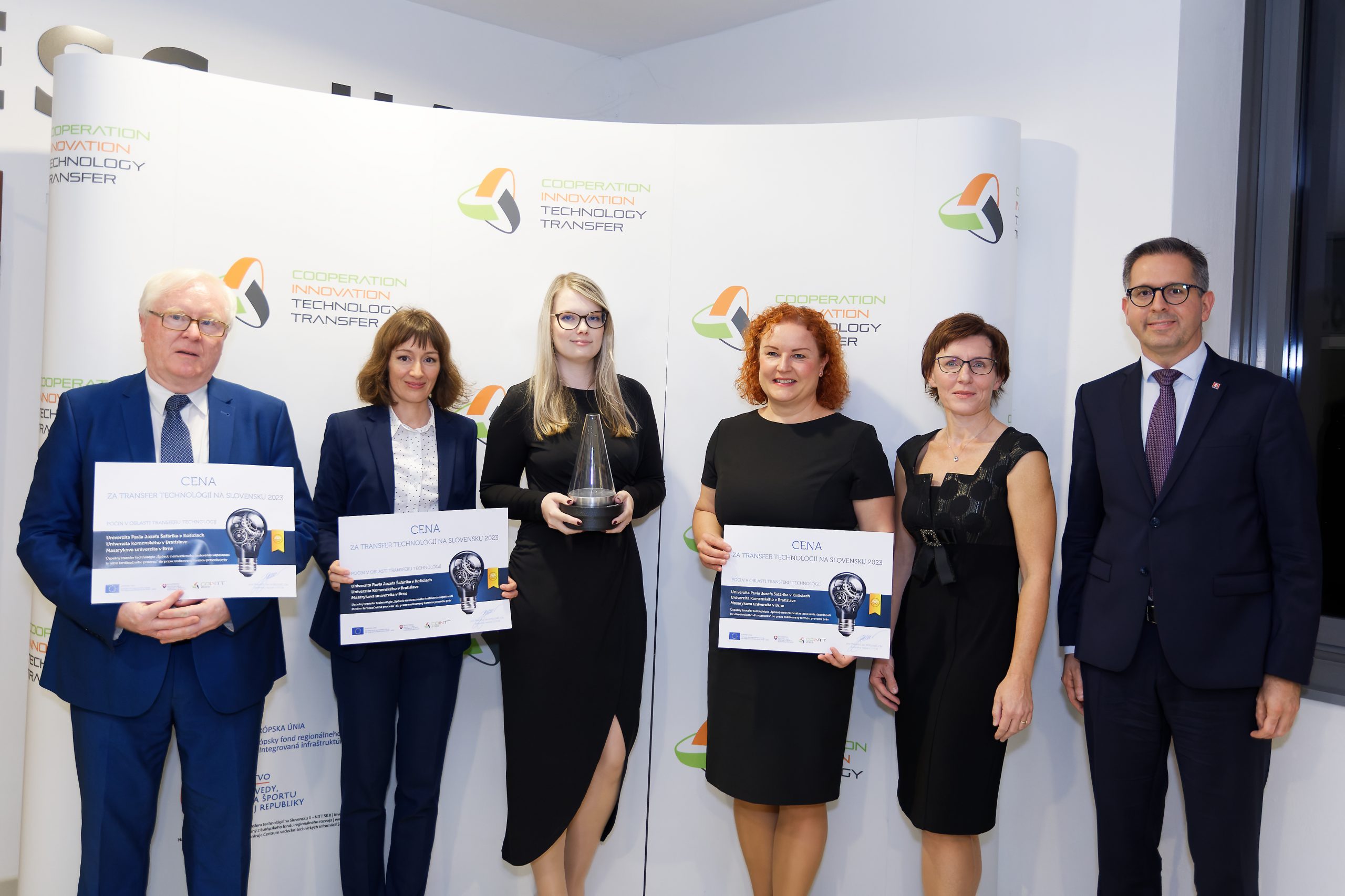 Ocenenie v kategórii Počin v oblasti transferu technológií získali zástupcovia Technologického a inovačného parku Univerzity Pavla Jozefa Šafárika v Košiciach a jeho Centra transferu technológií, Vedeckého parku Univerzity Komenského v Bratislave a jeho Centra transferu technológií a Centra pre transfer technológií na Masarykovej univerzite v Brne za úspešný transfer technológie Spôsob neinvazívneho testovania úspešnosti in vitro fertilizačného procesu do praxe realizovaný formou prevodu práv.