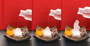 Podchladenú destilovanú vodu pomaly vylievame na niečo studené, napríklad na kúsok ľadu. Samozrejme, môžeme použiť zamrznutú fľašu bežnej vody. Prípadne môžeme fľašou udrieť o podložku. Destilovaná voda v okamihu zamrzne.