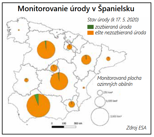 Americký Národný úrad pre letectvo a vesmír (NASA), ESA a Japonská agentúra pre výskum letectva a kozmonautiky (JAXA) nedávno vytvorili informačný panel COVID-19 Earth Observation Dashboard. Ide o platformu , ktorá kombinuje množstvo satelitných údajov na sledovanie dosahov COVID-19 na celom svete vrátane poľnohospodárskej výroby. V spolupráci s Európskou komisiou vyvinula ESA systém spracovania Sen4CAP, ktorý sa použil aj na celoštátne monitorovanie úrody v Španielsku. Nedávna štúdia Vplyv COVID-19 na rast a zber ozimných obilnín analyzovala úrodu ozimných obilnín v Španielsku. V tejto krajine sa ozimné obilniny pestujú na takmer dvoch miliónoch hektárov, a to najmä v regiónoch Kastília a León, Andalúzia, Kastília-La Mancha a Aragónsko. Vďaka satelitným údajom je možné úrody monitorovať v takmer reálnom čase po celej krajine. Vedci z Katolíckej univerzity v belgickom Leuvene použili údaje získané z misií Copernicus Sentinel-1 a Sentinel-2 a americkej misie Landsat-8 spolu so strojovým učením na týždenné sledovanie plodín.
