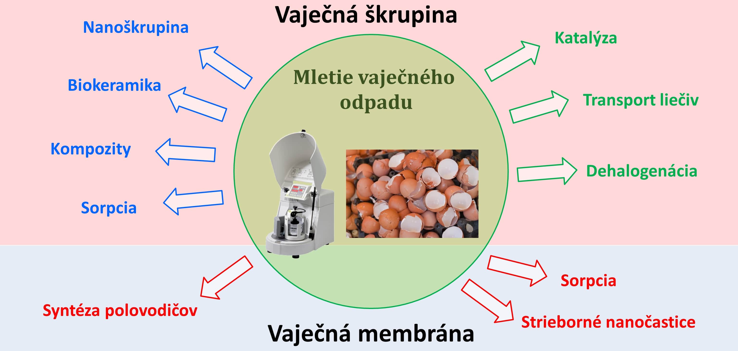 Mletím vaječného odpadu možno aplikačný potenciál tohto materiálu zvýšiť, pričom tento proces pôsobí na jednotlivé zložky rozdielne. Zatiaľ čo v prípade škrupiny vznikajú nanočastice s vyšším špecifickým povrchom (SA), v prípade membrány dochádza k deštrukcii vláknitej štruktúry a k redukcii špecifického povrchu SA. Najpočetnejšia skupina štúdií z oblasti využitia vaječného odpadu sa venuje biokeramike. Škrupina slúži ako zdroj vápnika pre fosforečnanové zlúčeniny ako hydroxyapatit alebo fosforečnan trivápenatý, ktoré možno využiť v implantátoch. Predmetom záujmu je aj overovanie biokompatibility pripravených materiálov, t. j. testovanie, ako na nich porastú modelové bunky. Syntéza väčšinou prebieha tak, že najprv sa škrupina pomelie s prekurzorom fosforečnanovej skupiny, najčastejšie ide o kyselinu fosforečnú, a následne sa zmes vypáli pri vysokej teplote, čím dôjde k tvorbe požadovaného produktu a rastu jeho kryštálov. Okrem fosforečnanov boli podobným štýlom pripravené aj biokeramické materiály na báze škrupiny, kremeňa a oxidu horečnatého, napríklad diopsid alebo akermanit. Škrupinu možno využiť aj ako plnivo do kompozitných materiálov, kde hlavnú zložku tvoria rôzne polyméry. Jej prítomnosť viedla vo väčšine známych prípadov k lepším mechanickým vlastnostiam a väčšej stabilite. Mletie slúži na efektívne zabudovanie škrupiny do polymérnej matrice. Zastúpenie plniva sa pohybuje v rozmedzí 1 – 20 %. Významnú rolu hrá mletie aj pri zvyšovaní sorpčnej aktivity (zachytávanie škodlivých látok z odpadových vôd) oboch zložiek vaječného odpadu. V dôsledku rozdielneho chemického zloženia má škrupina a jej membrána rozdielnu schopnosť reagovať so zachytávanými látkami. Pri škrupine sa mletím dosahuje výrazné zlepšenie aktivity tak pre ióny ťažkých kovov, ako aj pre farbivá, zatiaľ čo pre membránu sa pozoroval pozitívny vplyv mletia iba pri sorpcii farbív. Vďaka mletiu sa podarilo dosiahnuť viac ako 8-násobný nárast sorpčnej schopnosti škrupiny v prípade iónov kadmia. Vaječný odpad možno využiť aj na cielený transport liečiv v tele pacienta, na dehalogenáciu (odstraňovanie halogénových prvkov, t. j. fluór, chlór, bróm, jód) z toxického odpadu, katalýzu organických reakcií, v kombinácii s kremenným pieskom na leštenie povrchov či na prípravu materiálov s antibakteriálnym účinkom. Zomletá vaječná membrána môže slúžiť aj ako zdroj síry (je prítomná v aminokyselinách v membráne) pre chemickú reakciu. Jej mletím s octanom olovnatým vzniká sulfid olovnatý PbS, polovodičový materiál využiteľný v solárnych článkoch.