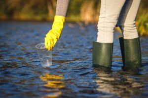 Volunteer is picking up plastic cup waste from water