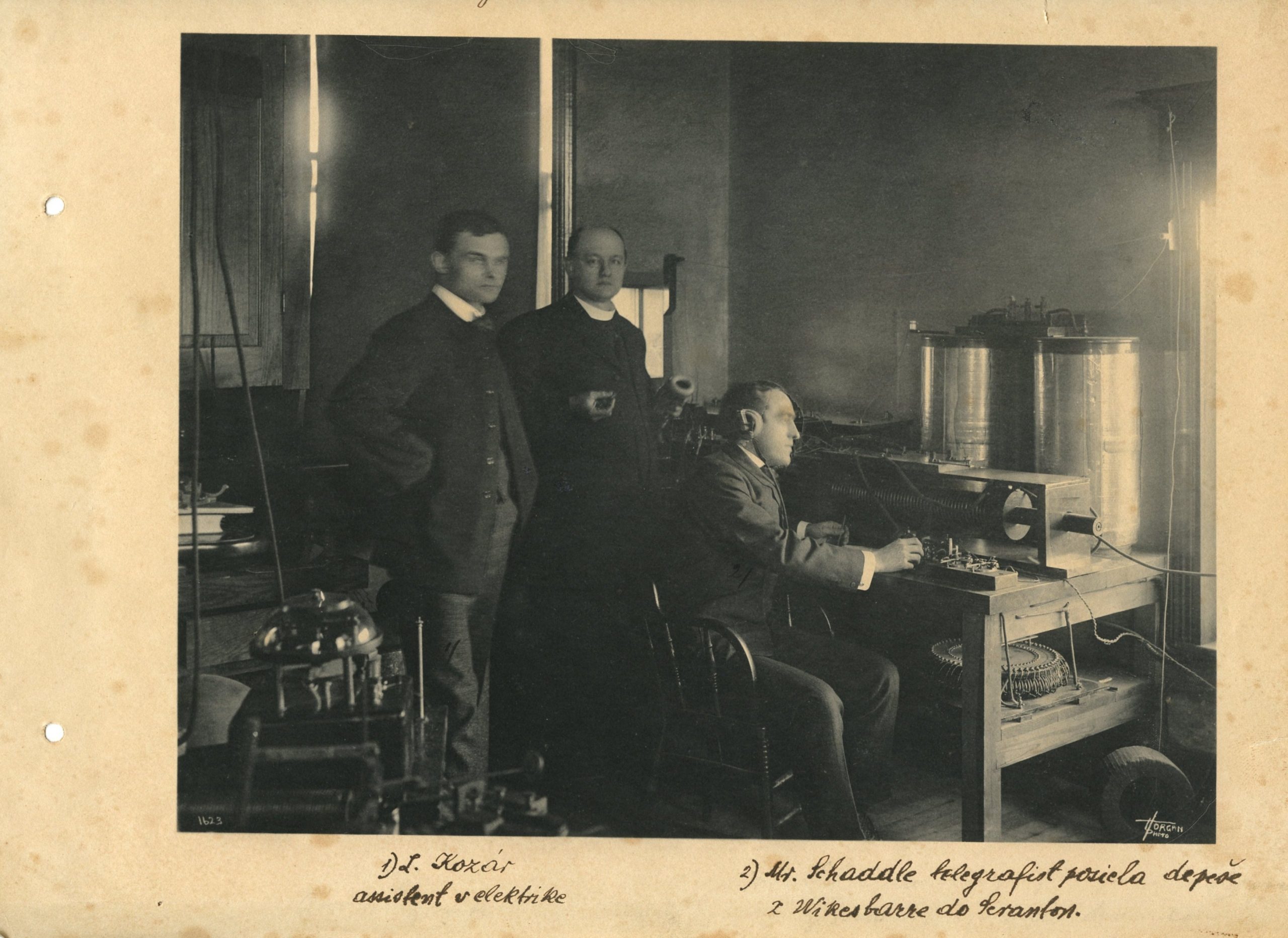 Fotografia z laboratória vo Wilkes-Barre pri skúške v roku 1905, na ktorej sú prítomní L. Korzár, J. Murgaš a Mr. Schaddle, foto archív Klubu Jozefa Murgaša a Jozefa Gregora Tajovského