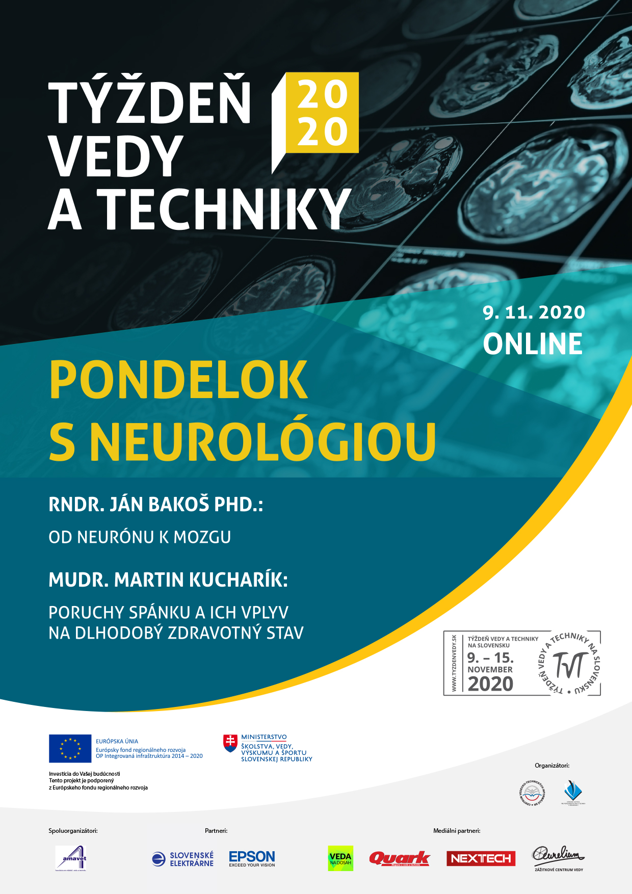 Pondelok s neurológiou sa uskutoční v pondelok 9. 11. 2020 ako jedno z hlavných podujatí v rámci Týždňa vedy a techniky na Slovensku 2020 v Centre vedecko-technických informácií SR v online forme bez fyzickej prítomnosti divákov. Podujatie bude rozdelené na dva bloky prednášok, predpoludním o 9.00 h a popoludní o 17.00 h. Obidve prednášky budú následne sprístupnené pre širokú verejnosť aj online.