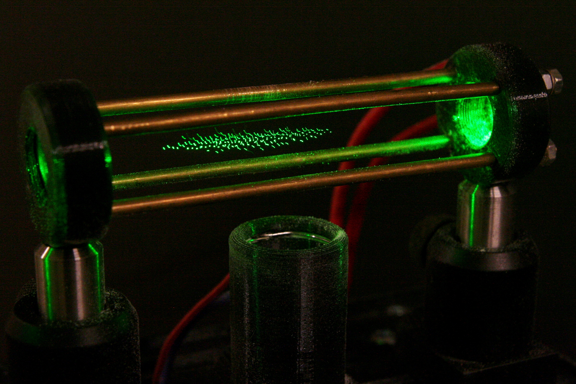 Zrnká múky v hranatej sklenenej trubici podsvietené zeleným svetlom