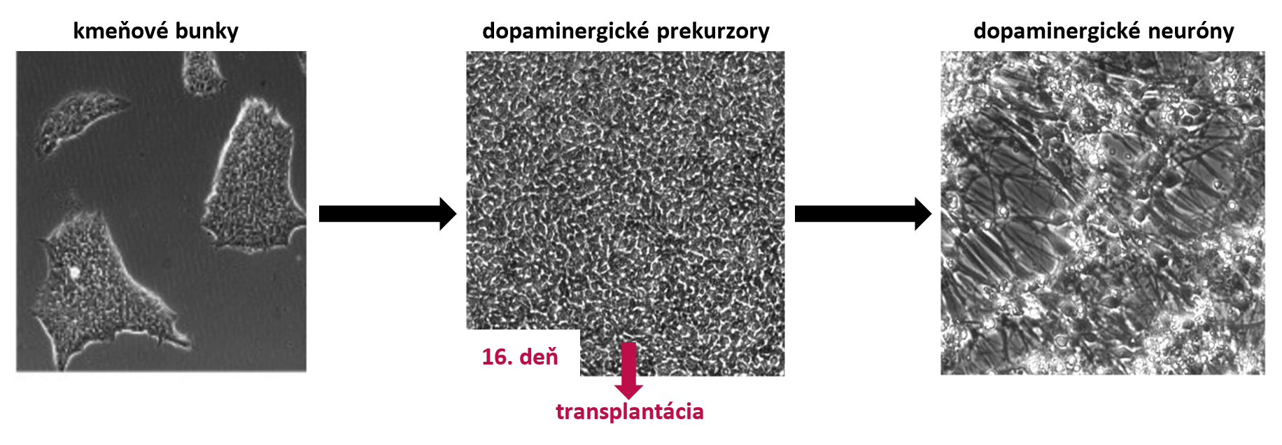 Kmeňové bunky sa pridaním správnych molekúl do bunkovej kultúry špecifikujú na DA prekurzory a DA neuróny. Na šestnásty deň sú prekurzory transplantovateľné, zdroj Kunath, 2020, University of Edinburgh lecture, úprava autorka.