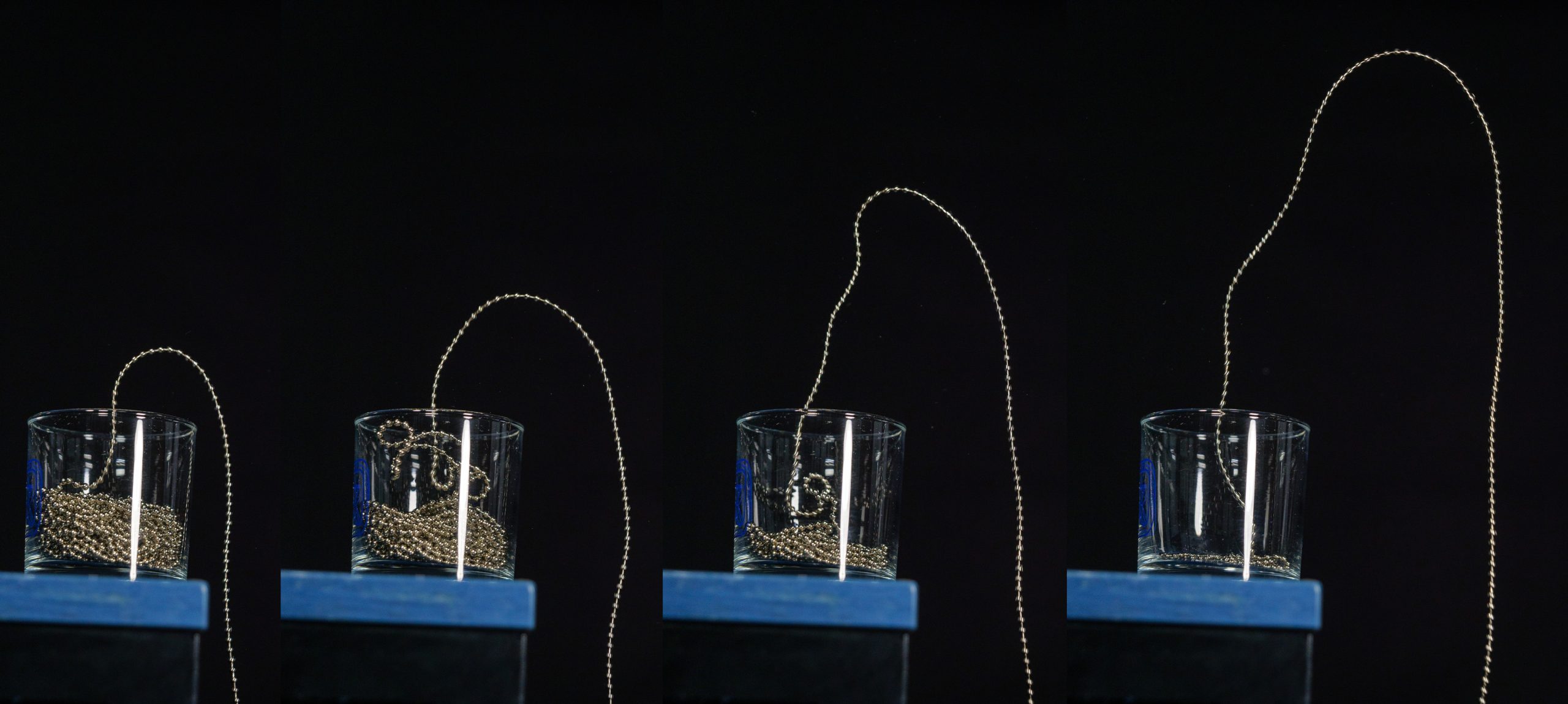 Experiment, ktorý ukazuje, že rýchlosť pádu reťaze môže byť ovplyvnená tým, že reťaz dopadá na podložku, vám predstavíme v nasledujúcom príspevku. Rovnako ukážeme, že reťaz vyťahovaná z nádoby pôsobí tlakom na reťaz pod sebou, pričom reakčná sila ju následne vymršťuje von z nádoby.
