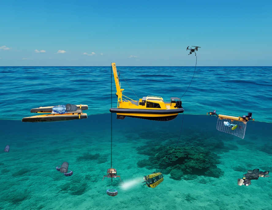 Ilustrácia systému plavidiel a robotov na zber odpadu z morského dna