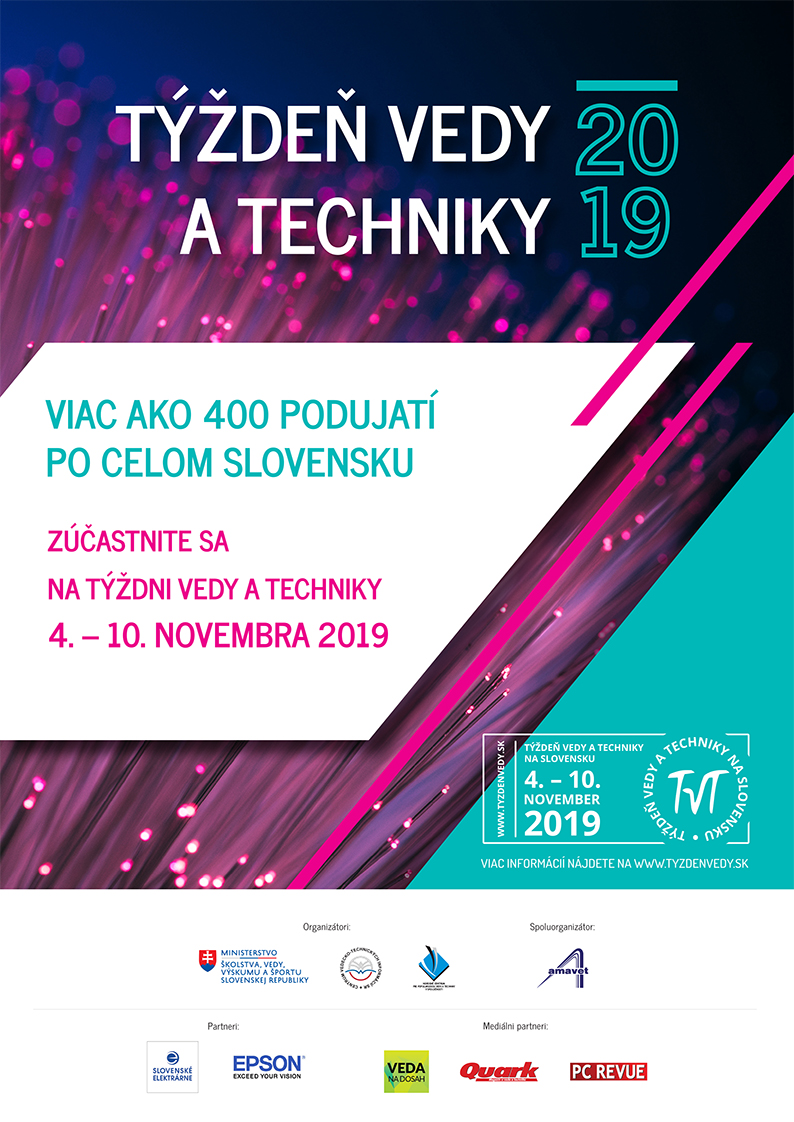 V pondelok 4. novembra 2019 sa oficiálne začína už šestnásty ročník Týždňa vedy a techniky na Slovensku – TVT 2019 a potrvá až do nedele 10. novembra 2019. Vyvrcholí tak Vedecká jeseň nabitá podujatiami zameranými na popularizáciu vedy a techniky. Opäť budete môcť objavovať vedu počas viac ako štyristo popularizačných podujatí po celom Slovensku, ako sú napríklad prednášky, festivaly, workshopy či najrôznejšie súťaže s vedecko-technickým zameraním.