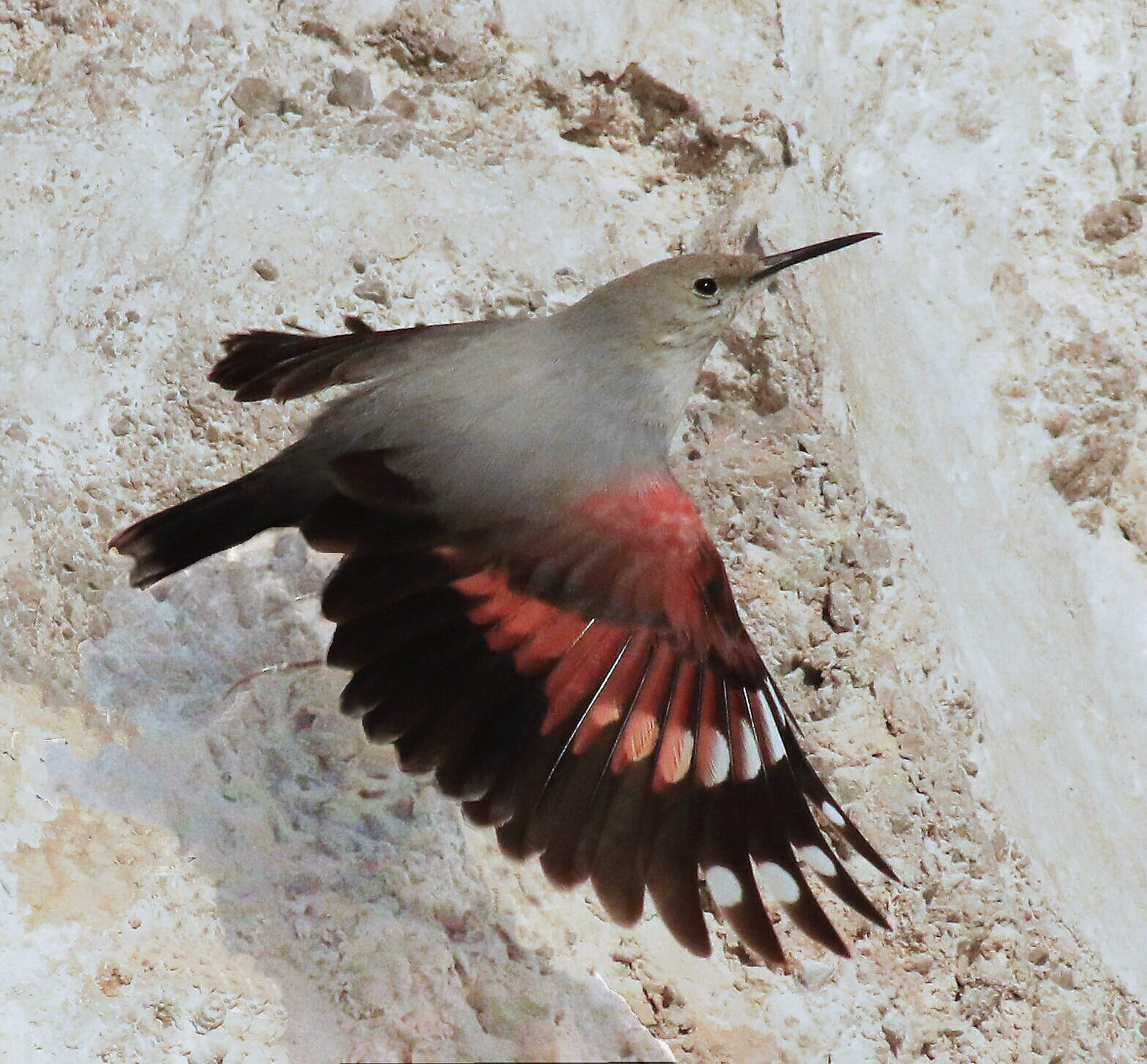 Detailný záber na krídla murárika odhaľuje karmínovočervené sfarbenie s bielymi škvrnami