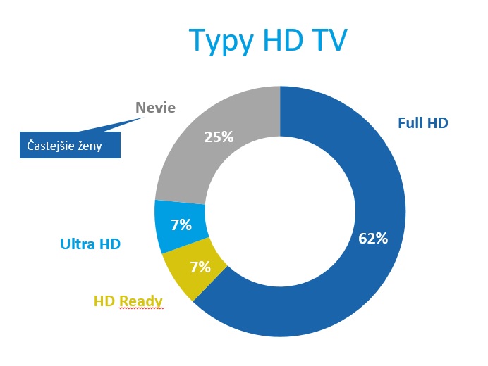 Najrozšírenejším typom HD televízora v domácnosti sú Full HD (62 %), druhé dva varianty má zhodne 7 % ľudí. Štvrtina majiteľov HD televízorov, ale nevie, aký druh vlastnia.